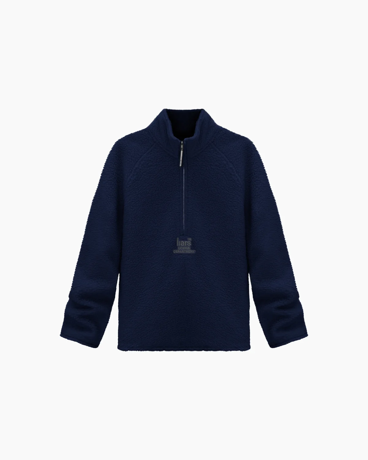 Синяя флиска на молнии, выполненная из мягкого и плотного флиса с эффектом шерсти («барашек»). Изделие оснащено высоким воротником-стойкой на молнии до середины груди (half-zip). Под молнией расположена лаконичная вышивка «liars collective DESIGN DEPARTMENT». Особое внимание уделено фурнитуре: центральная молния оснащена брендированным металлическим пуллером с гравировкой.