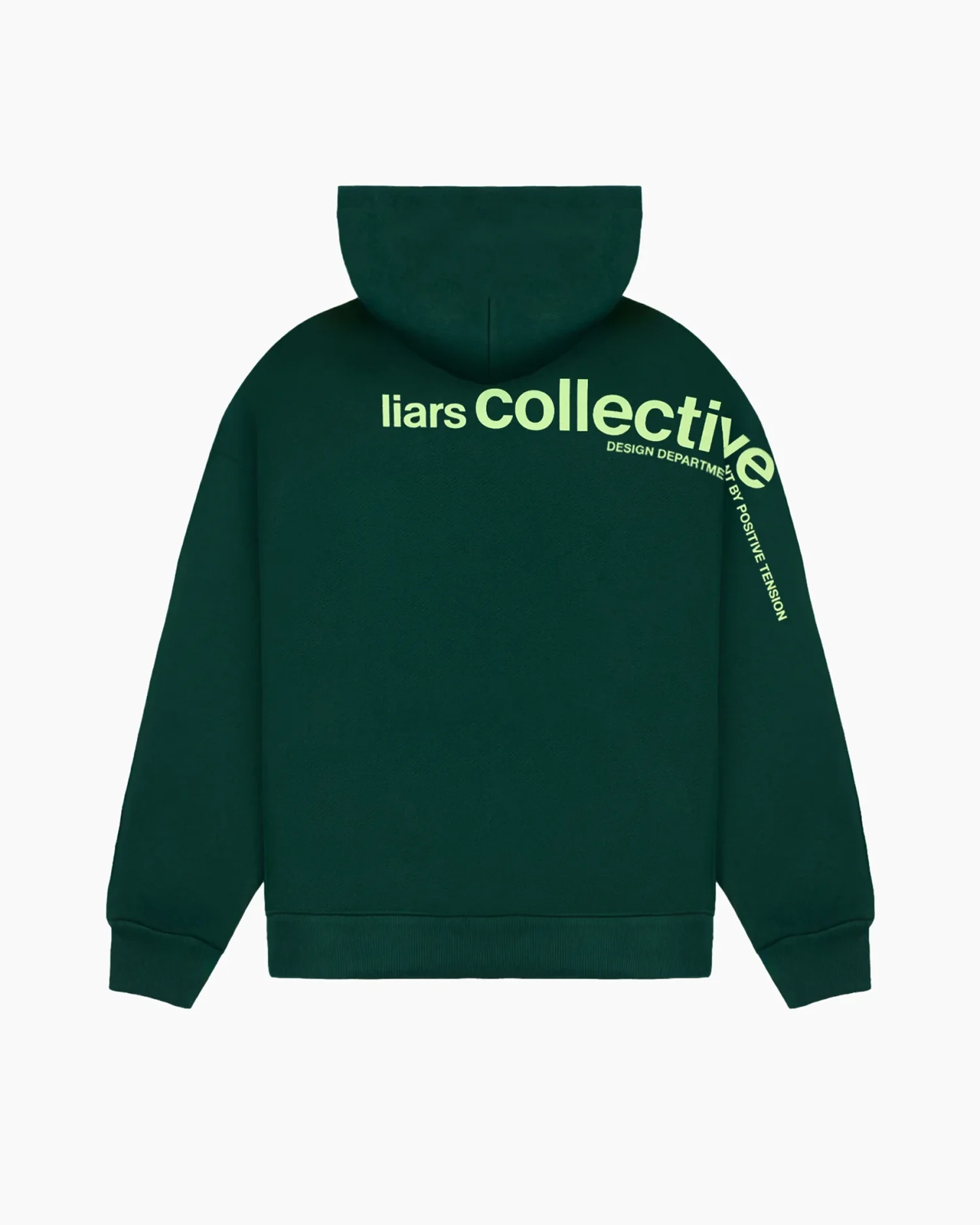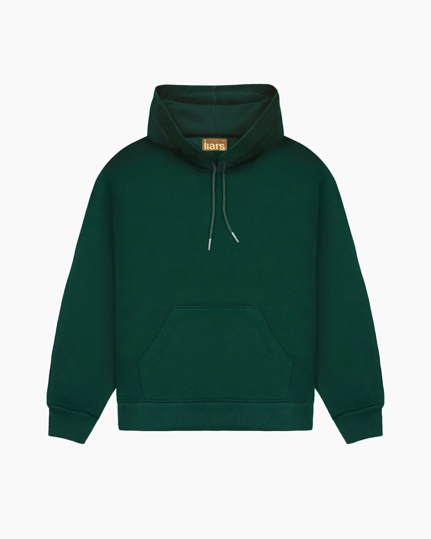 Худи глубокого изумрудного оттенка, выполненное из плотного футера Свободный крой дополнен объемным капюшоном и эластичными манжетами. На спинке расположен крупный изогнутый принт с логотипом бренда, выполненный в контрастном цвете. Особое внимание уделено деталям: шнурки капюшона оснащены брендированными металлическими наконечниками (аглетами) с гравировкой Liars Collective.