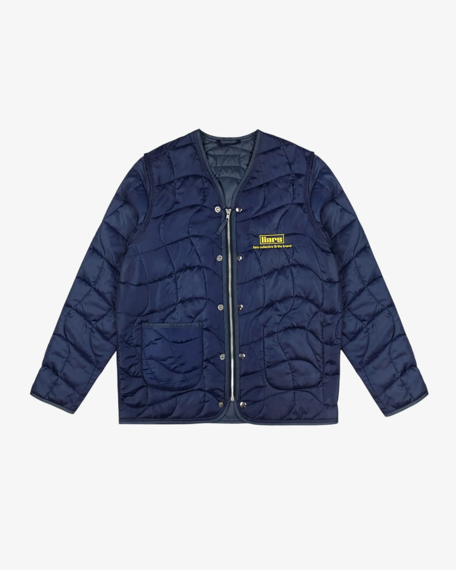 Темно-синяя стеганая куртка-лайнер, выполненная из прочного нейлона с легким благородным блеском. Отличительной чертой модели является сложная волнообразная стежка, которая придает изделию уникальную фактуру и объем. Лайнер оснащен двойной системой застежки: надежной металлической молнией и ветрозащитной планкой на кнопках. На груди расположен акцентный желтый патч «liars collective ® the brand», добавляющий контрастности глубокому синему цвету. Модель дополнена V-образным вырезом, накладным карманом спереди и фирменной нашивкой на внутренней стороне воротника. Это универсальное изделие идеально подходит как для самостоятельной носки, так и в качестве функционального среднего слоя.