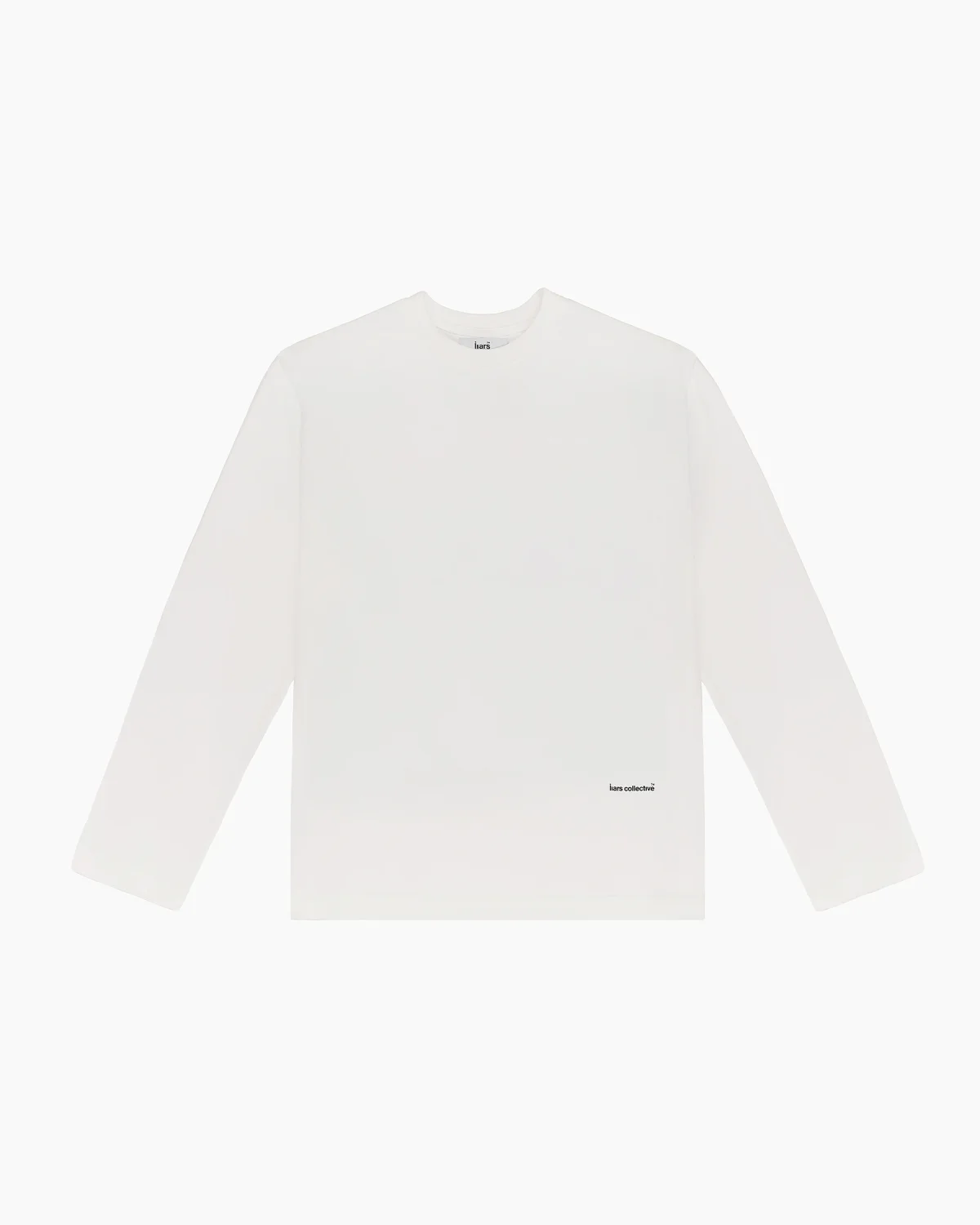Белый лонгслив свободного кроя, выполненный из плотного хлопка. Украшен сложной многослойной композицией на спине, включающей фотореалистичное изображение пчелы, графические элементы и типографику в стиле технической документации.
