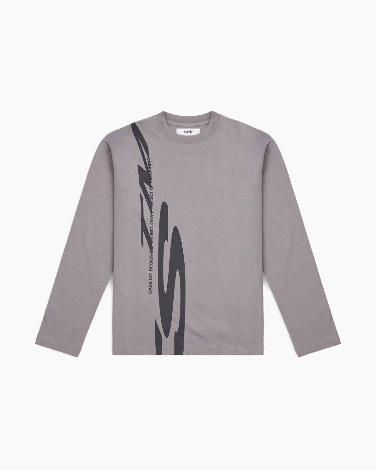 Лонгслив классического кроя в приглушенном серо-бежевом оттенке. Изделие дополнено масштабным вертикальным принтом на правой стороне, сочетающим в себе абстрактную графику и техническую типографику с указанием подразделения «LIARS CO. DESIGN DEPT.».