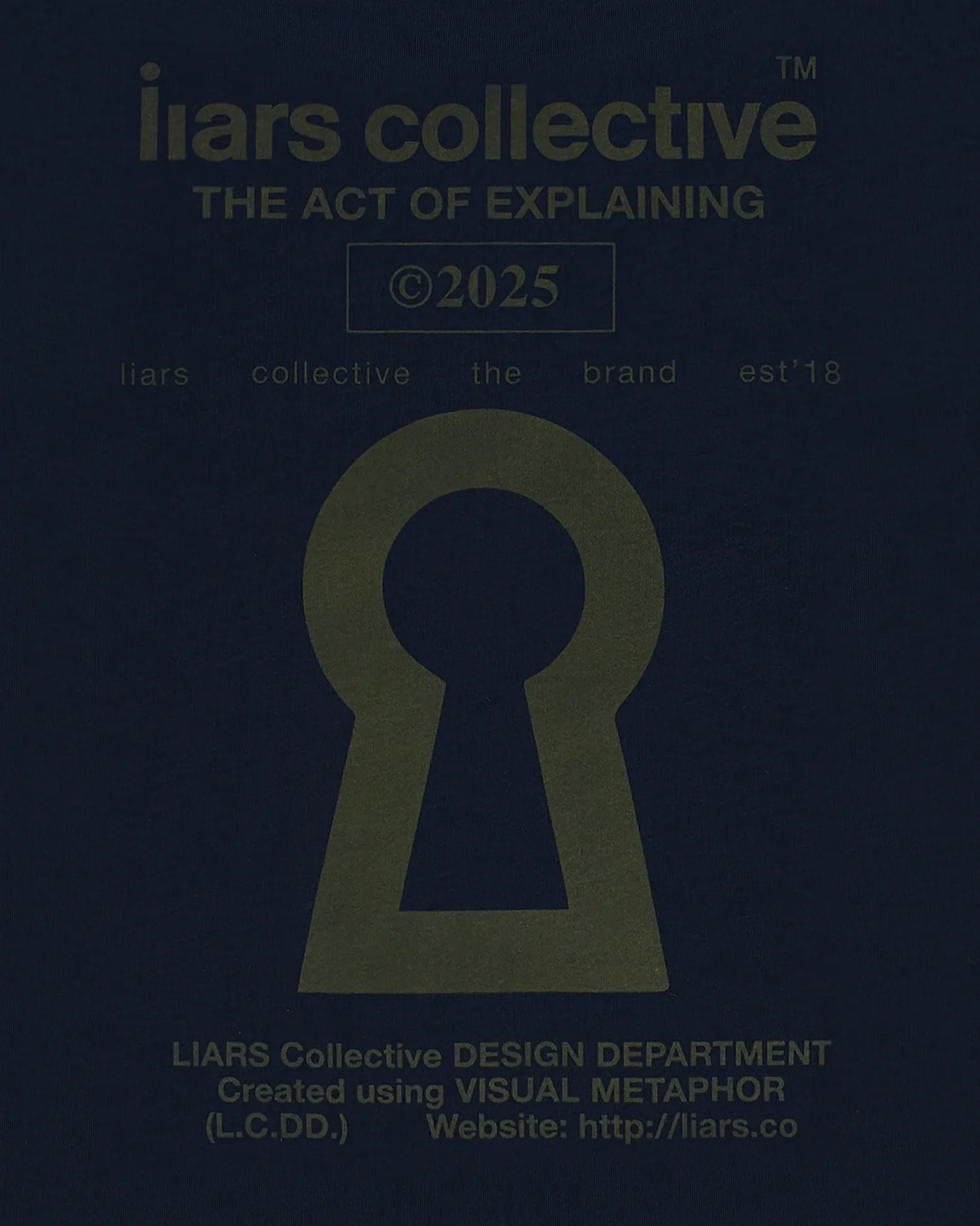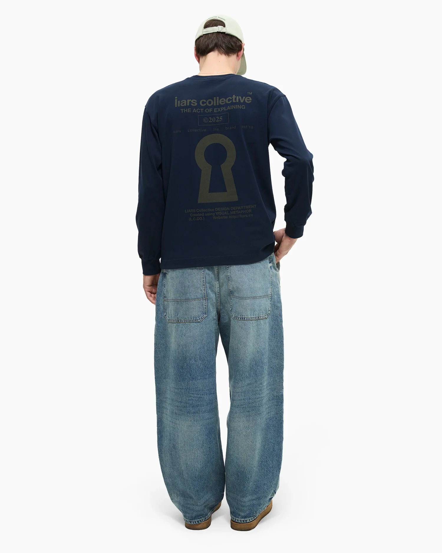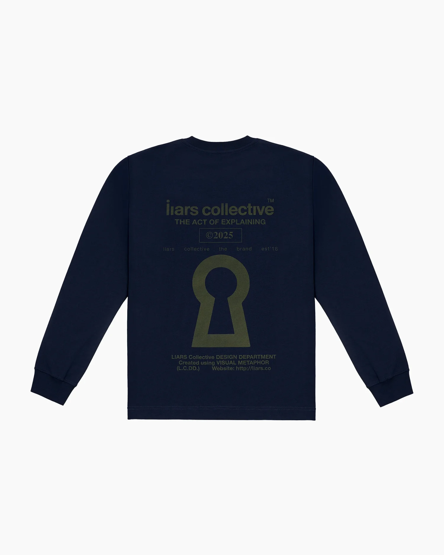 Темно-синий лонгслив прямого кроя, выполненный из плотного премиального хлопка. Фронтальная сторона дополнена лишь деликатным микро-принтом «liars collective the brand» в нижней части. На спинке расположен масштабный графический блок в приглушенном оливковом цвете: центральный символ в виде замочной скважины окружен манифестом «THE ACT OF EXPLAINING» и техническими данными дизайн-департамента. Модель имеет классический круглый вырез и эластичные манжеты, обеспечивающие идеальную посадку.