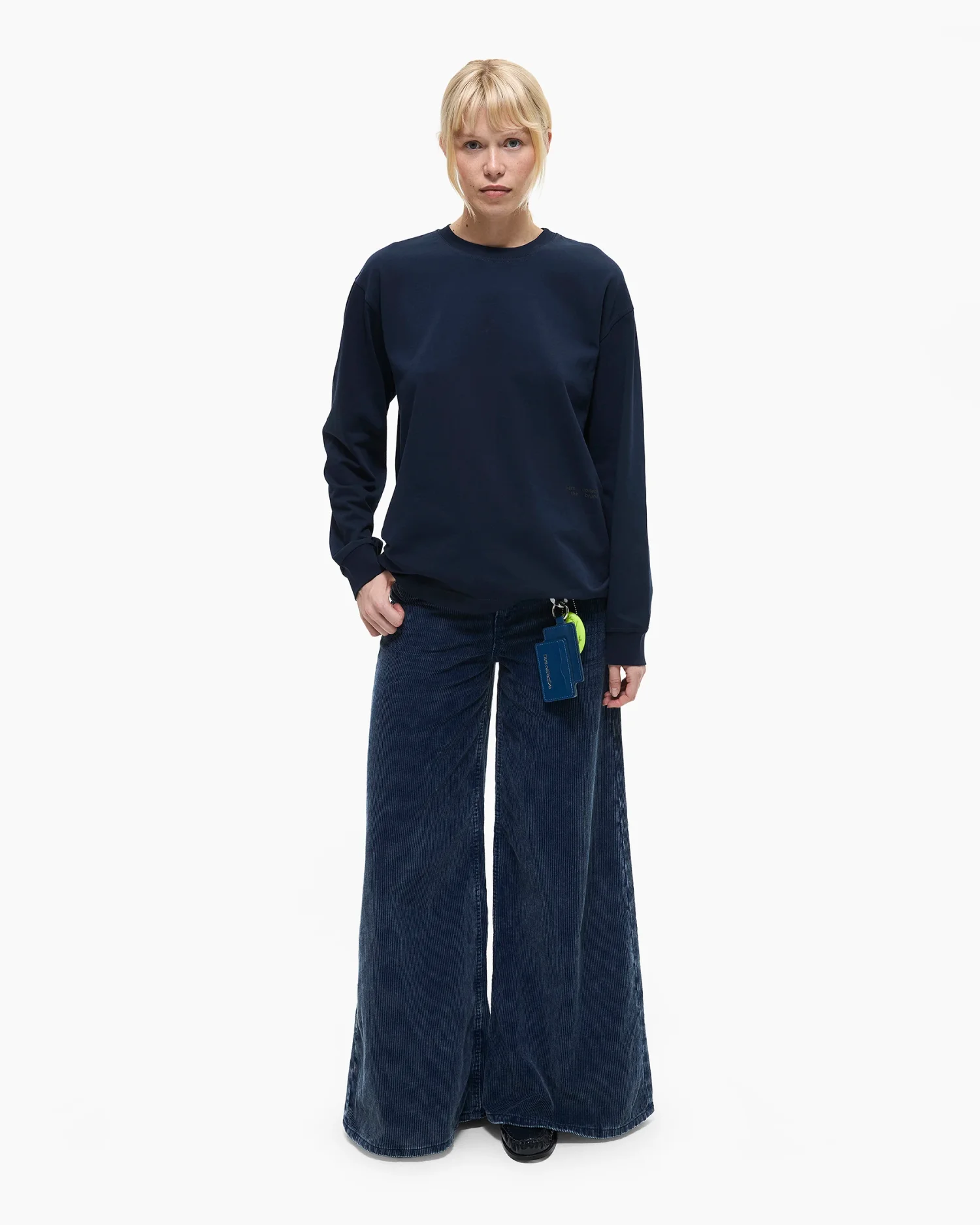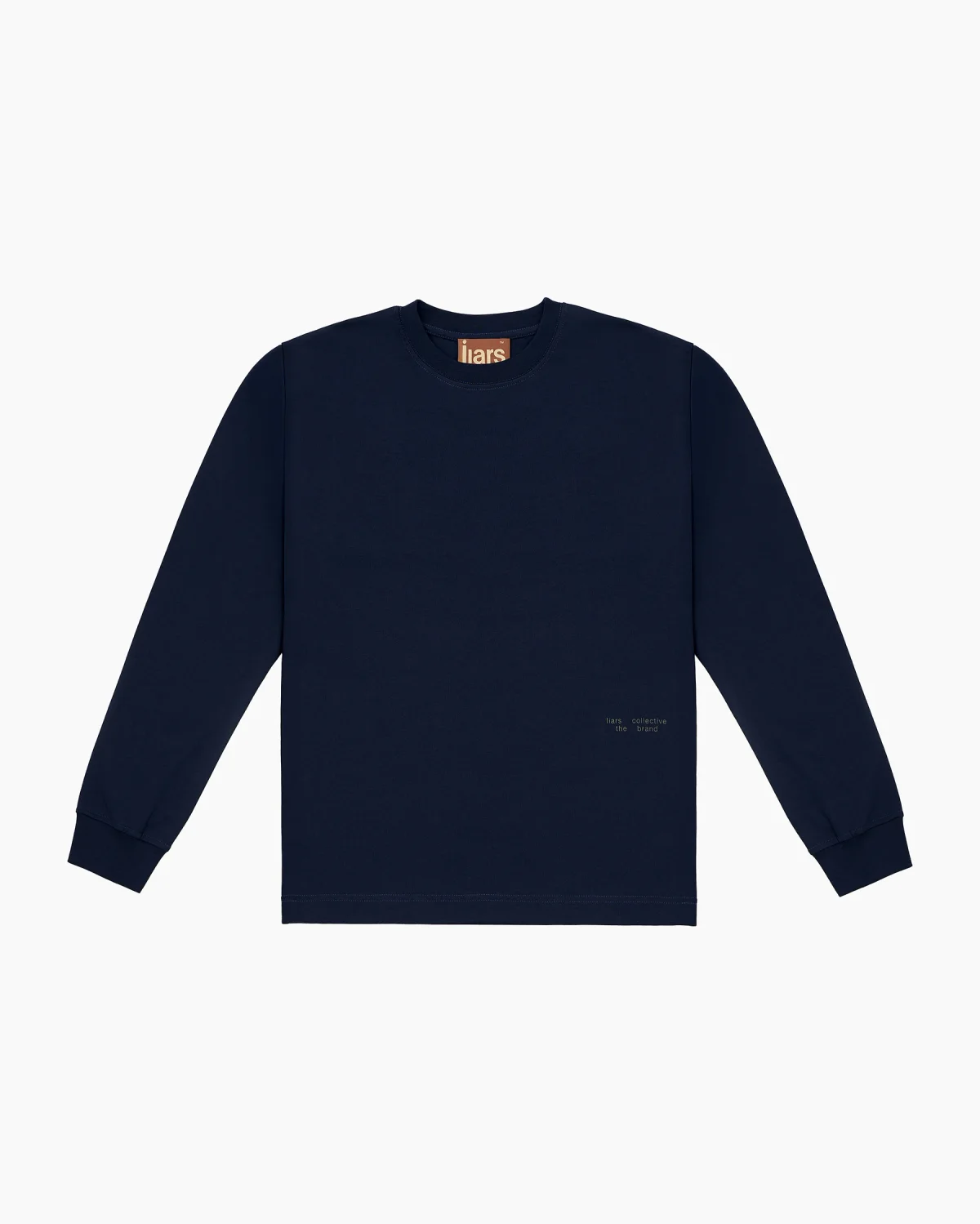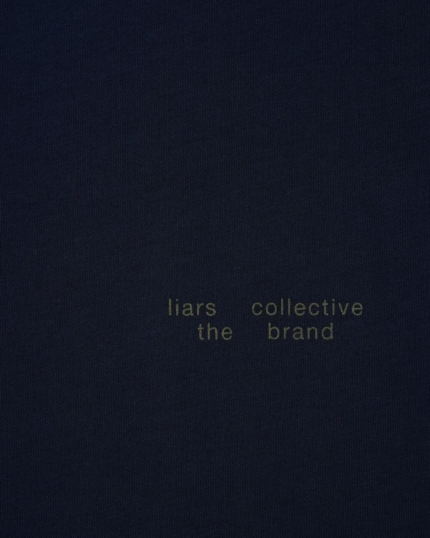 Темно-синий лонгслив прямого кроя, выполненный из плотного премиального хлопка. Фронтальная сторона дополнена лишь деликатным микро-принтом «liars collective the brand» в нижней части. На спинке расположен масштабный графический блок в приглушенном оливковом цвете: центральный символ в виде замочной скважины окружен манифестом «THE ACT OF EXPLAINING» и техническими данными дизайн-департамента. Модель имеет классический круглый вырез и эластичные манжеты, обеспечивающие идеальную посадку.
