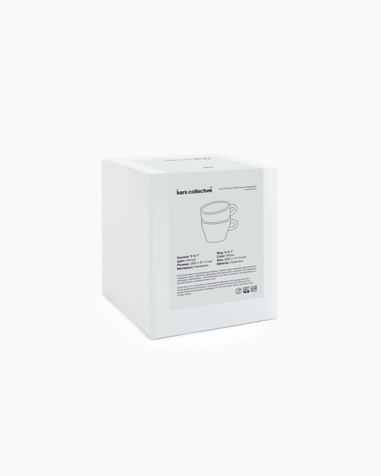 Концептуальный предмет интерьера и повседневного использования, выполненный из высококачественной белой керамики. Дизайн кружки представляет собой визуальную иллюзию: её форма имитирует две чашки, поставленные друг на друга, что создает архитектурный и авангардный силуэт.