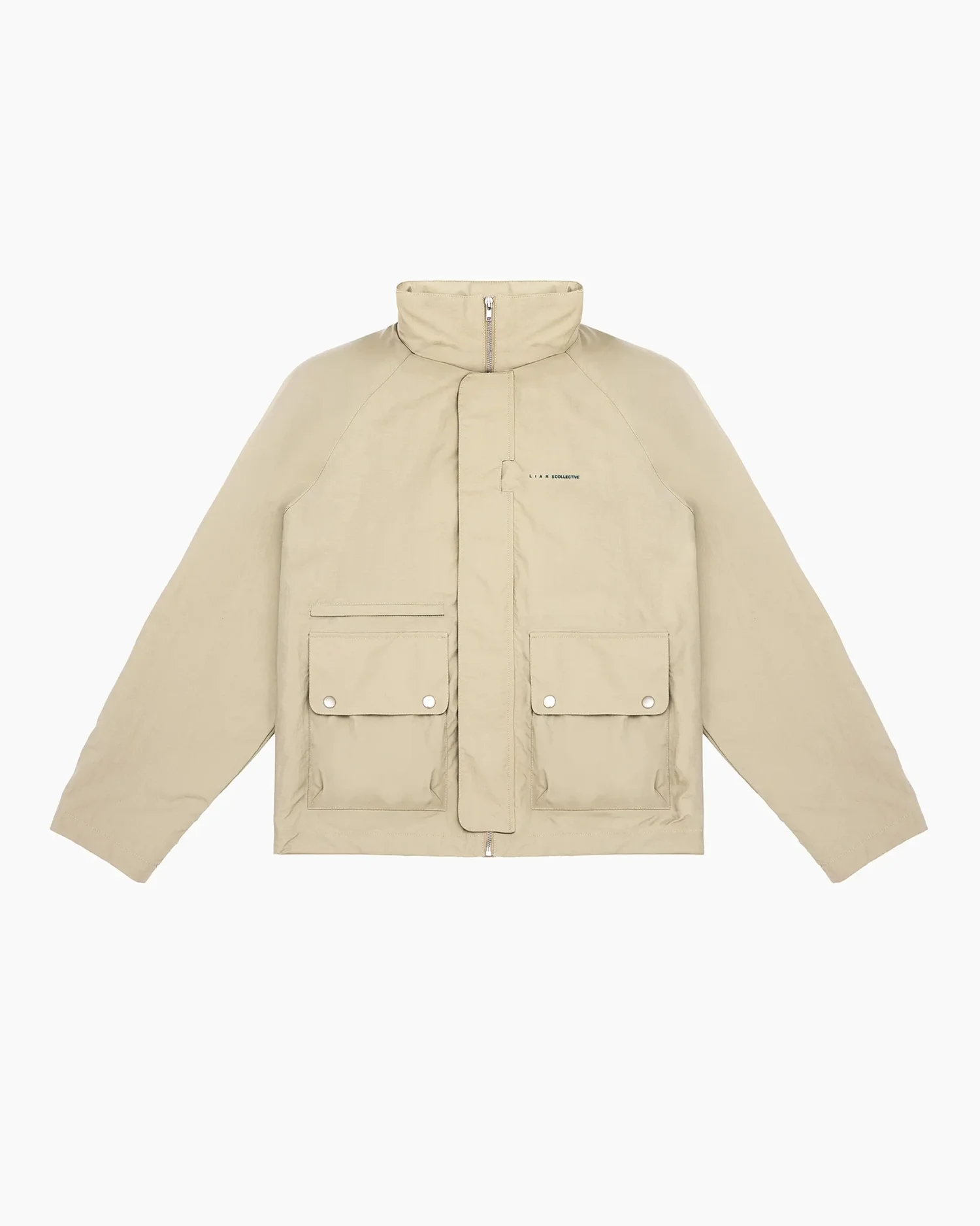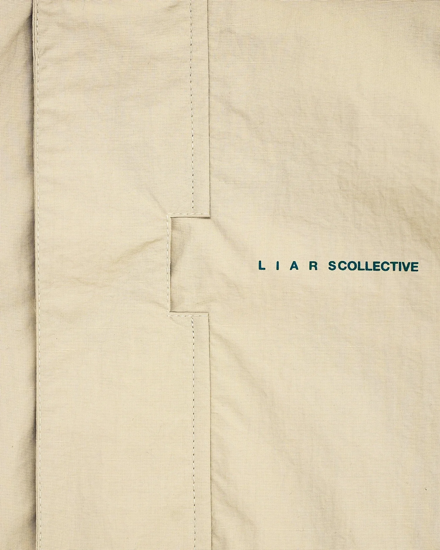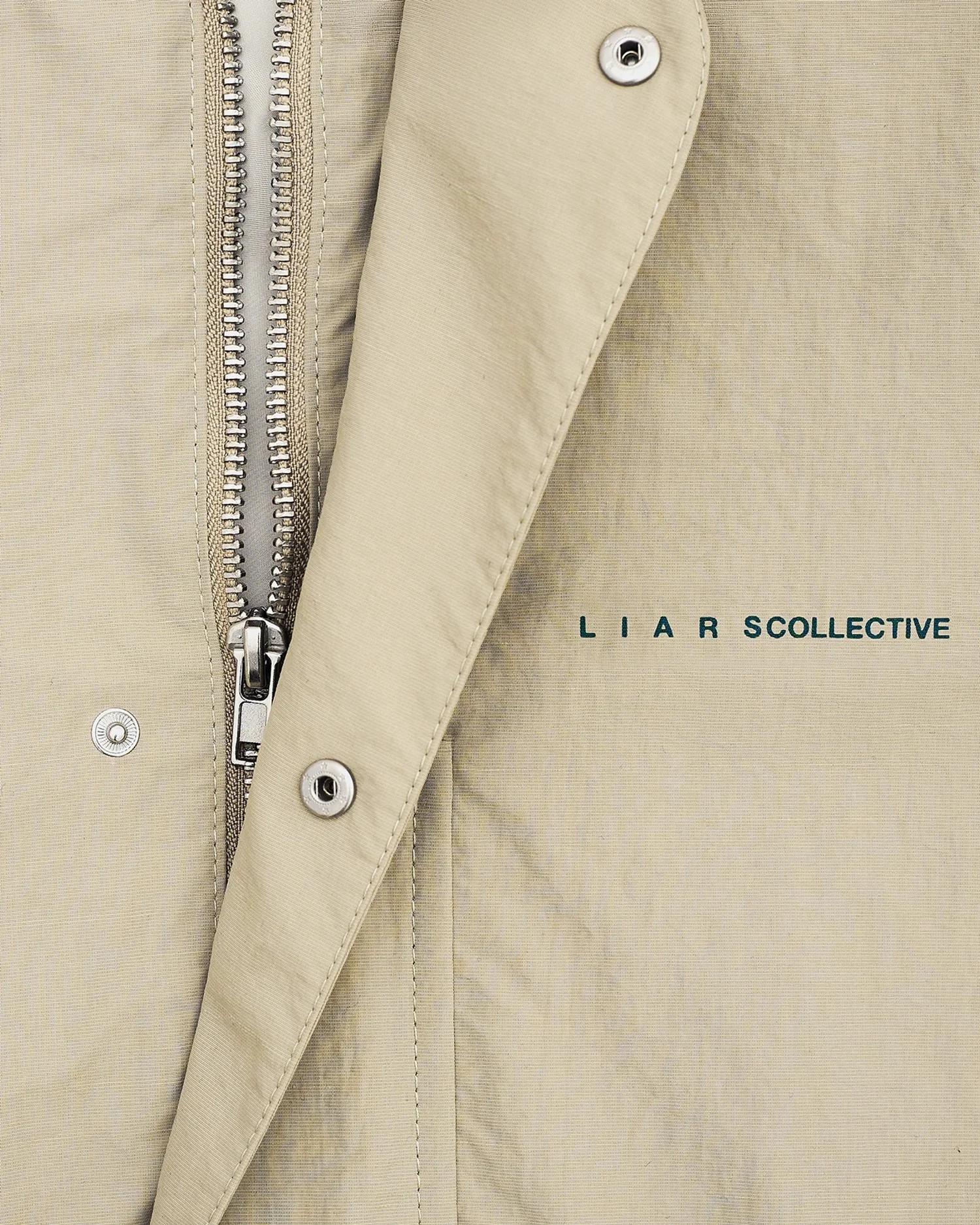 Бежевая куртка прямого кроя, выполненная из высокотехнологичного ветрозащитного материала. Ключевой особенностью является воротник-стойка со скрытым отсеком для компактного капюшона. Фронтальная часть дополнена массивными накладными карманами с клапанами на металлических кнопках и минималистичным логотипом Liars Collective. Основная застежка на молнии скрыта под широкой ветрозащитной планкой. На спинке расположен лаконичный принт «lc», а манжеты оснащены кнопками для регулировки объема. Универсальное изделие, адаптированное для переменчивой городской среды.