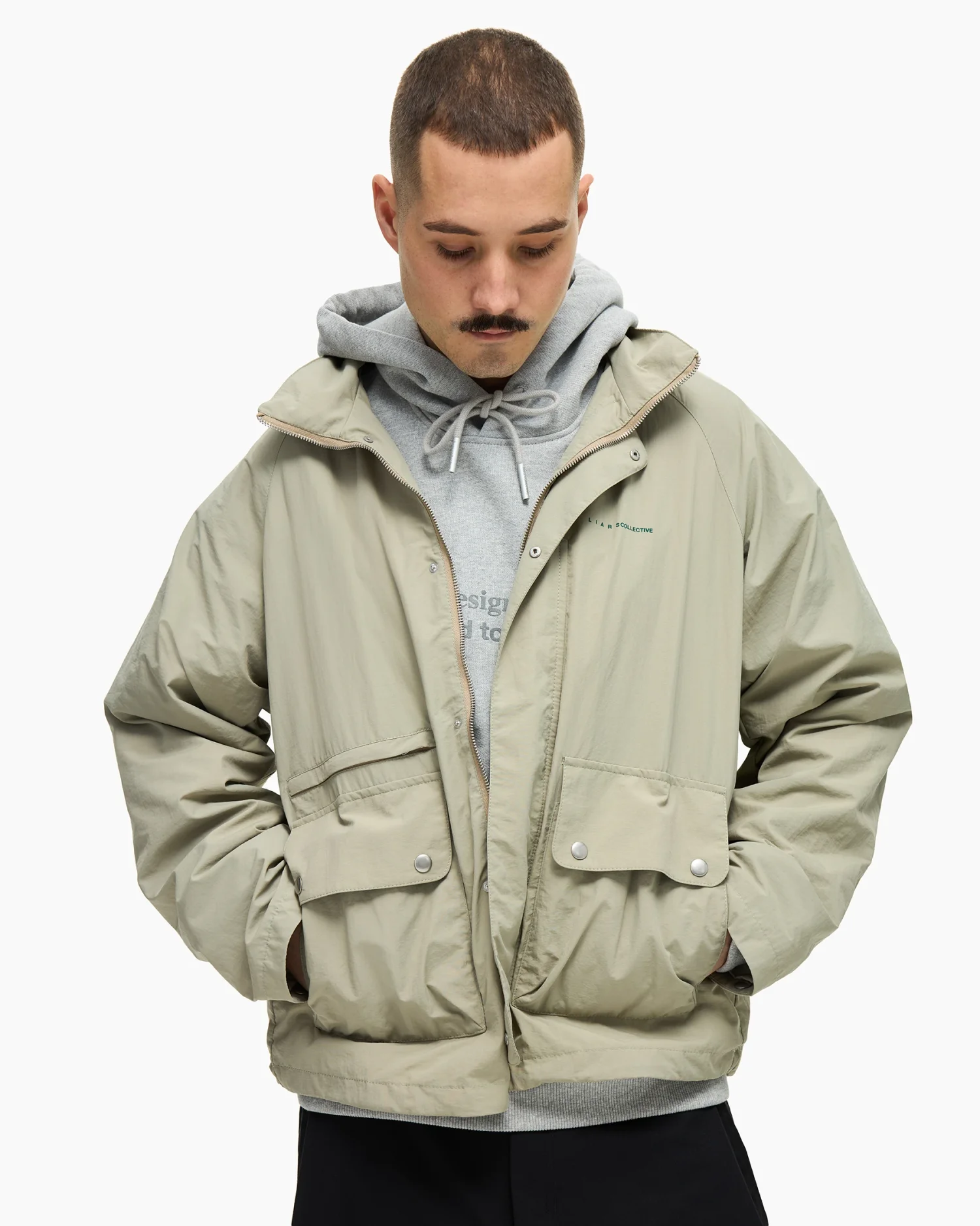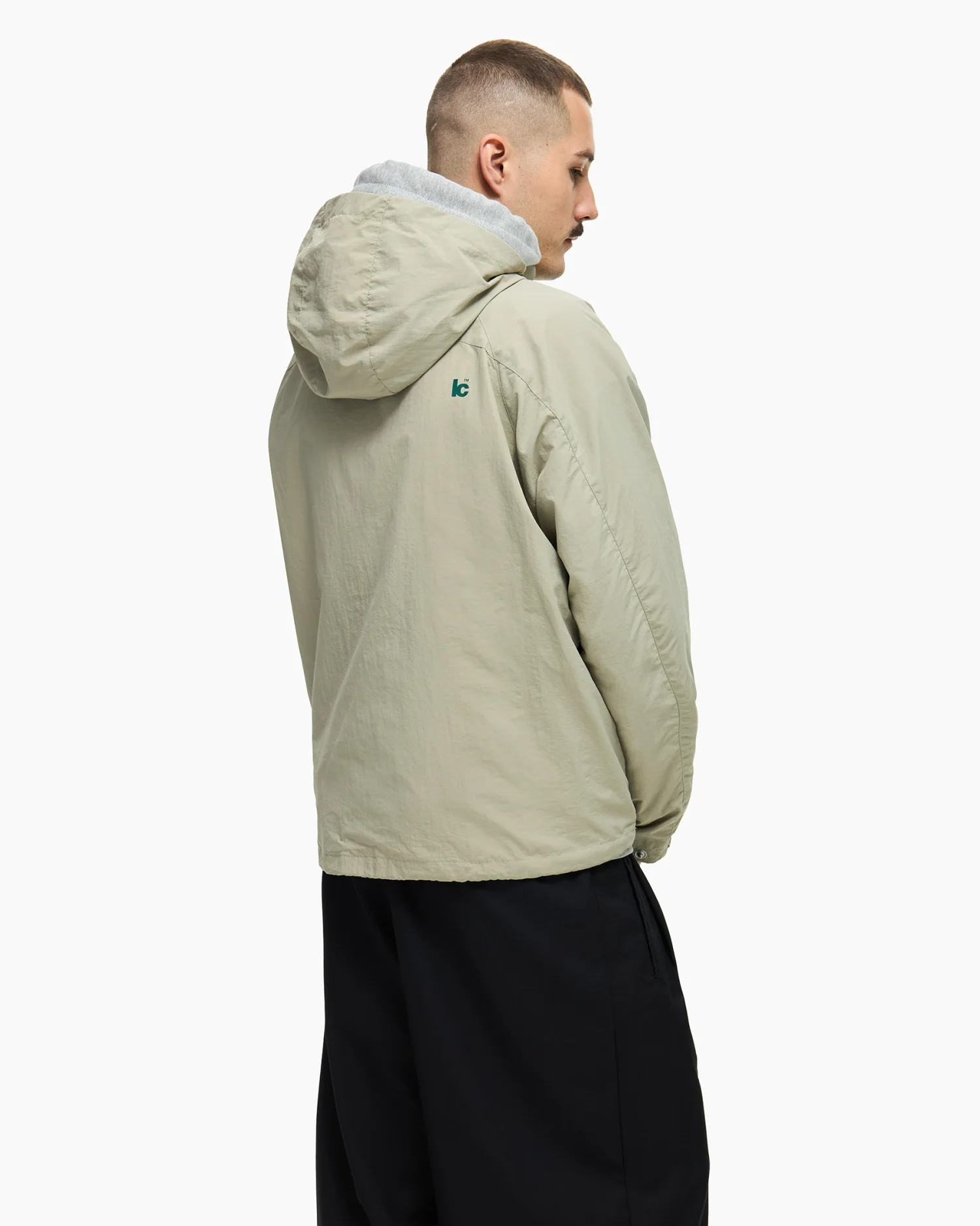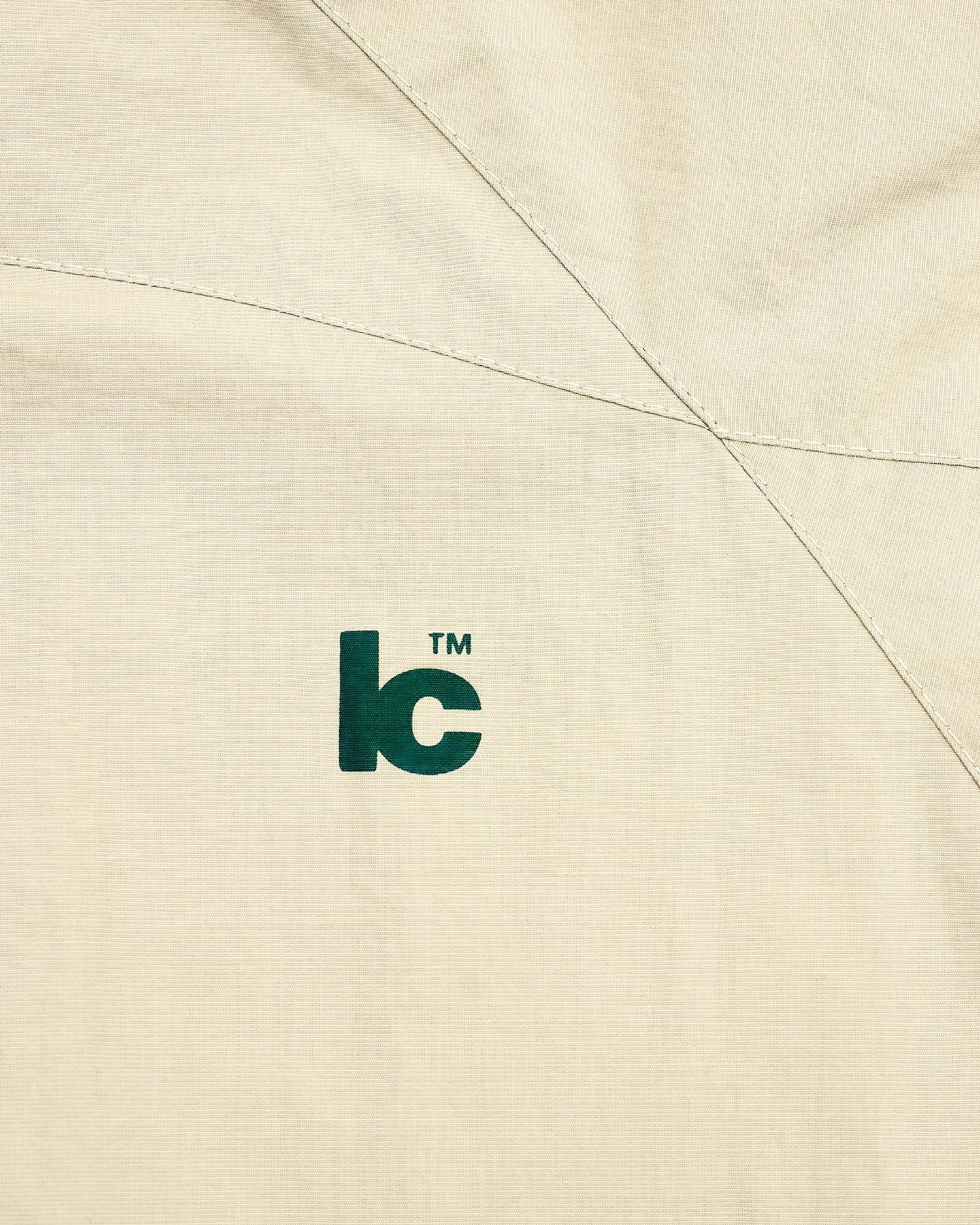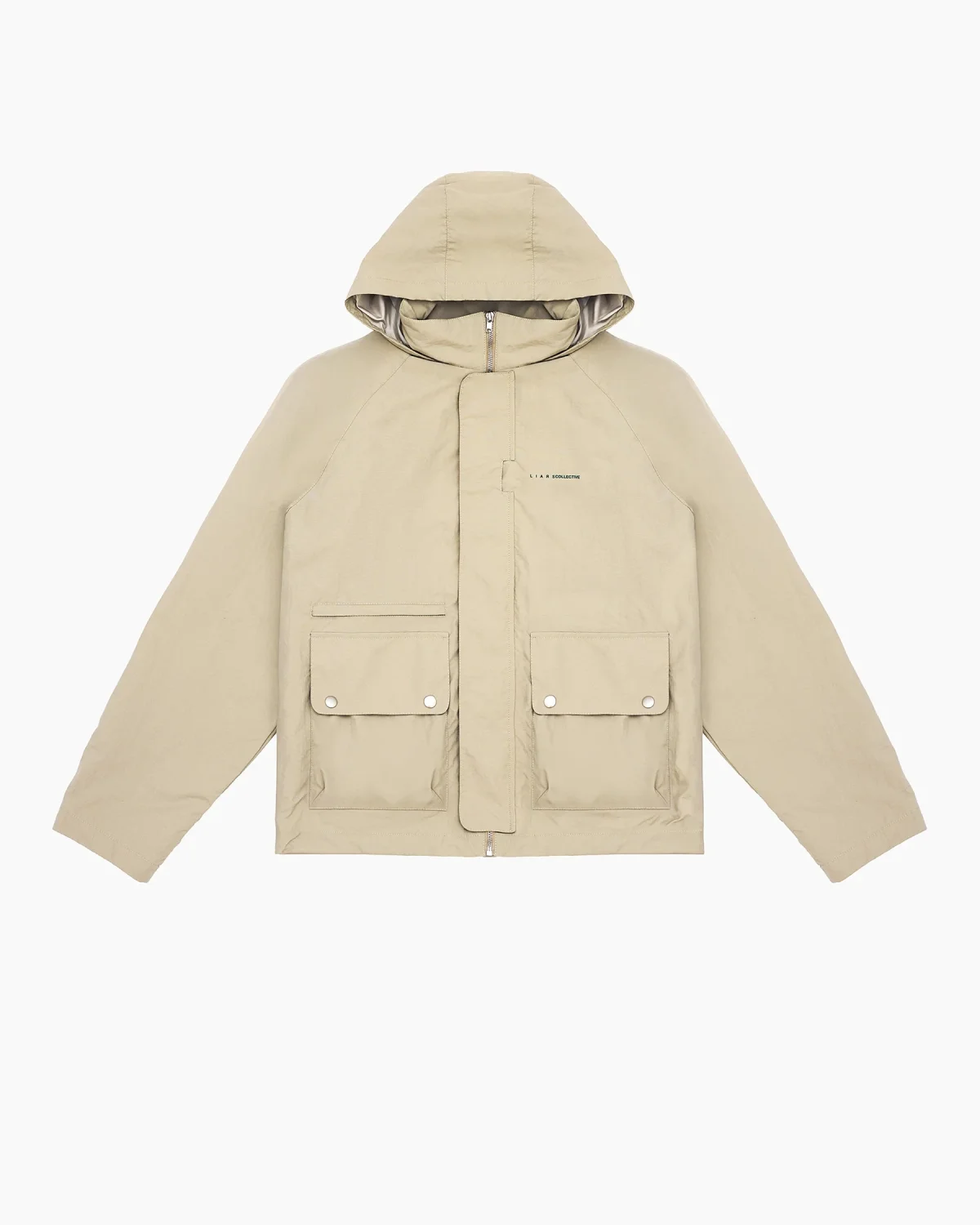 Бежевая куртка прямого кроя, выполненная из высокотехнологичного ветрозащитного материала. Ключевой особенностью является воротник-стойка со скрытым отсеком для компактного капюшона. Фронтальная часть дополнена массивными накладными карманами с клапанами на металлических кнопках и минималистичным логотипом Liars Collective. Основная застежка на молнии скрыта под широкой ветрозащитной планкой. На спинке расположен лаконичный принт «lc», а манжеты оснащены кнопками для регулировки объема. Универсальное изделие, адаптированное для переменчивой городской среды.