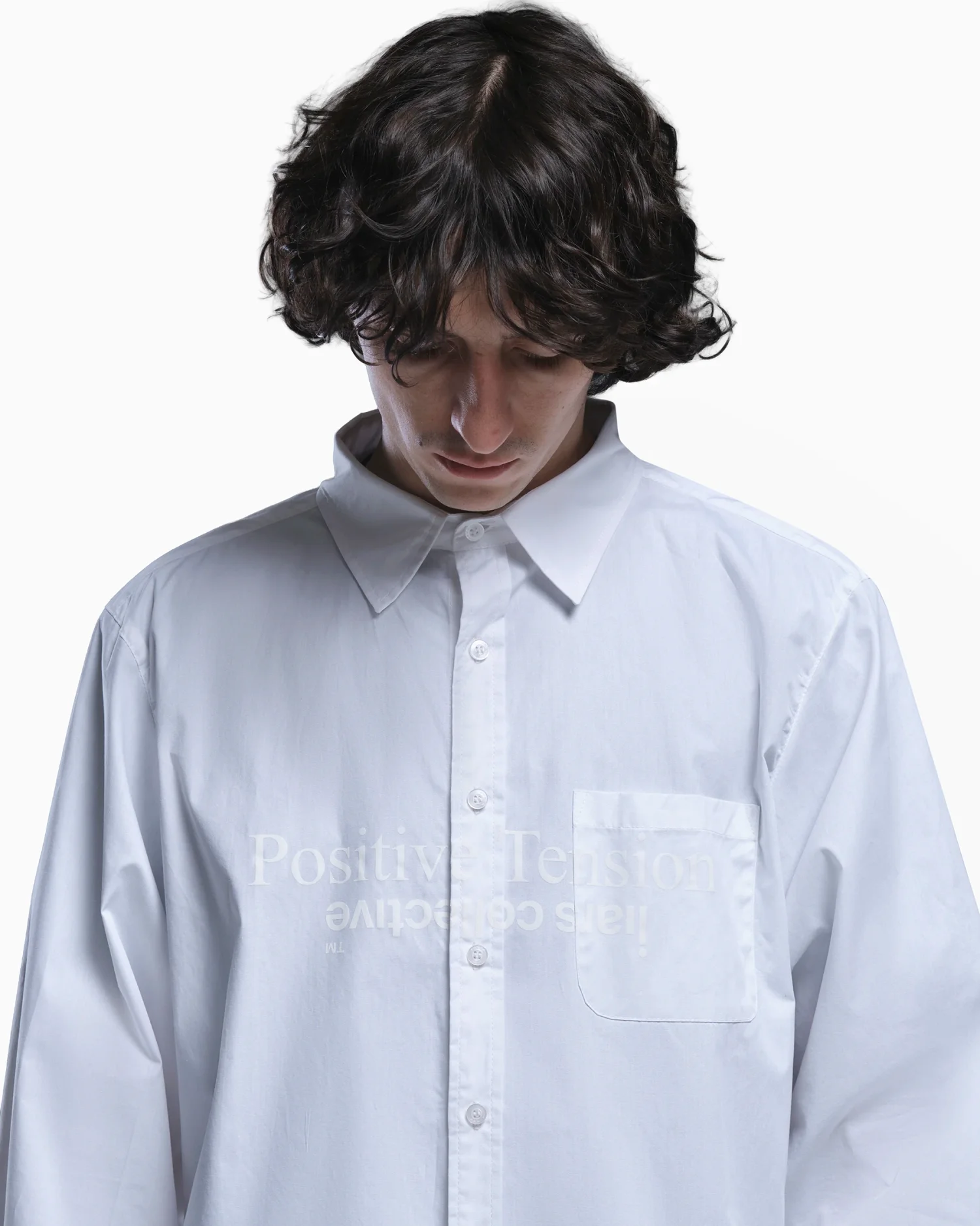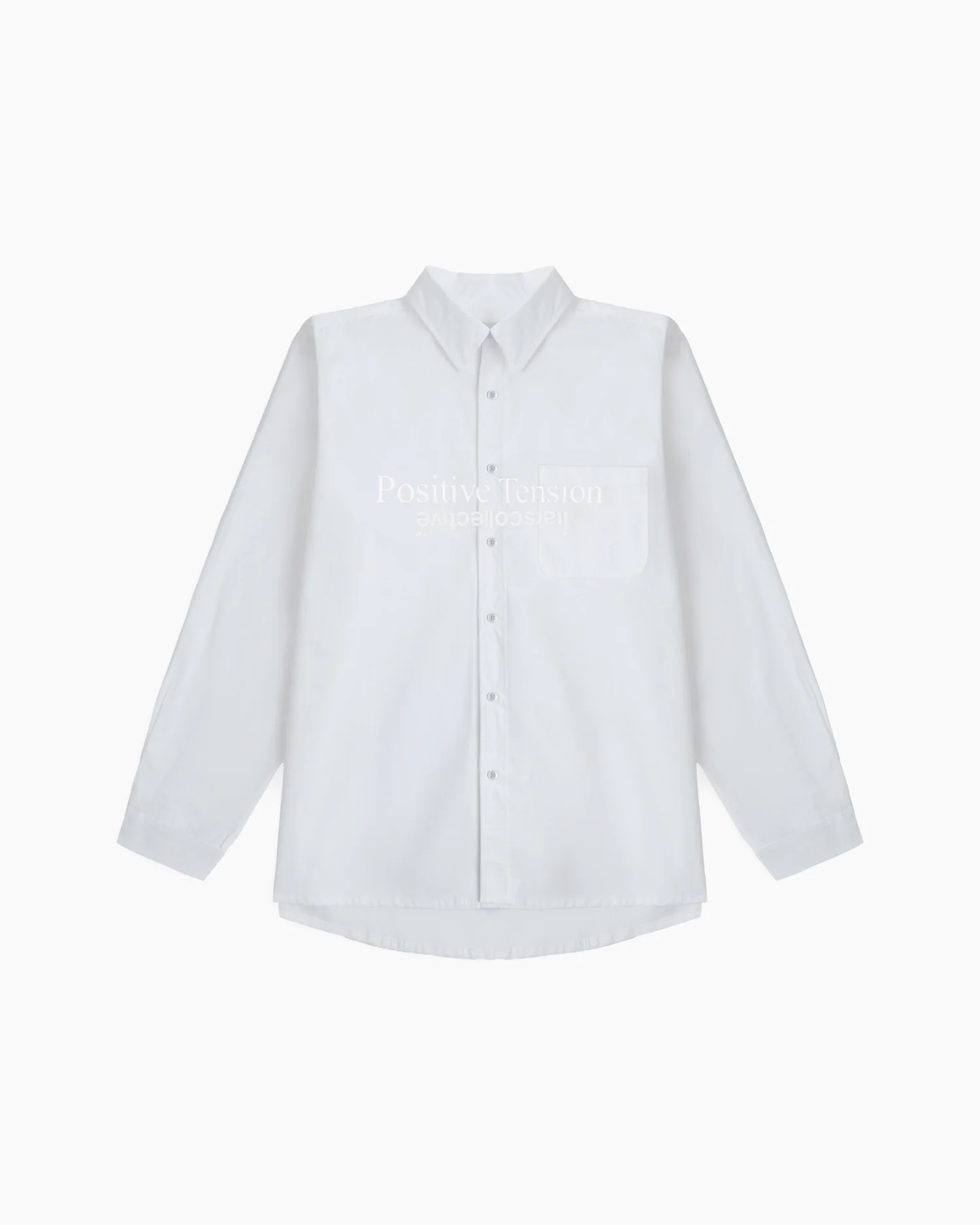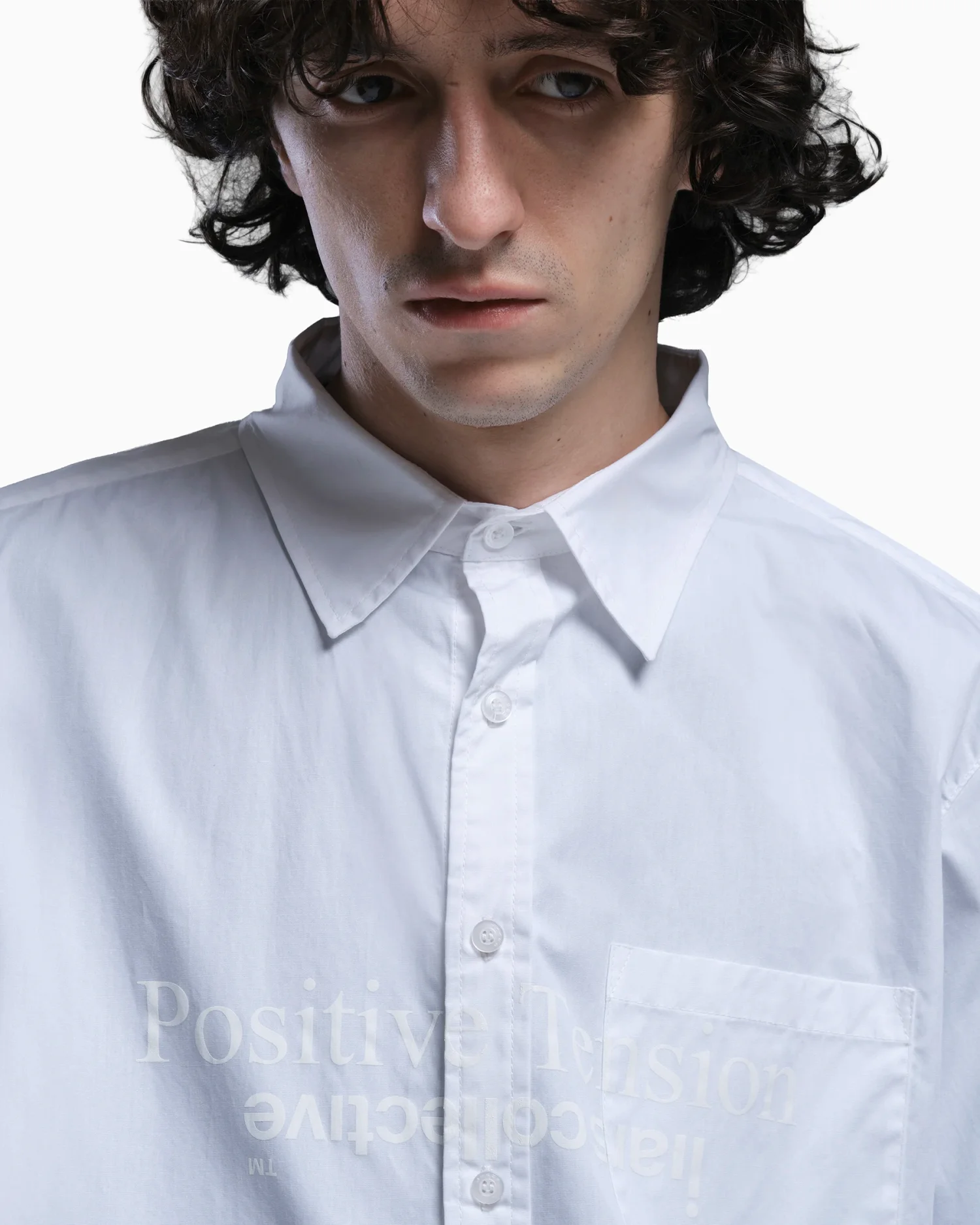 Белая рубашка свободного кроя, выполненная из плотного высококачественного хлопка. Модель отличается деконструированным подходом к брендингу: на передней части расположен инвертированный (перевернутый) текстовый принт «Positive Tension», перекрывающий нагрудный карман и планку. Спинка изделия декорирована масштабным полупрозрачным принтом с изображением скачущей лошади, выполненным в технике растровой графики.