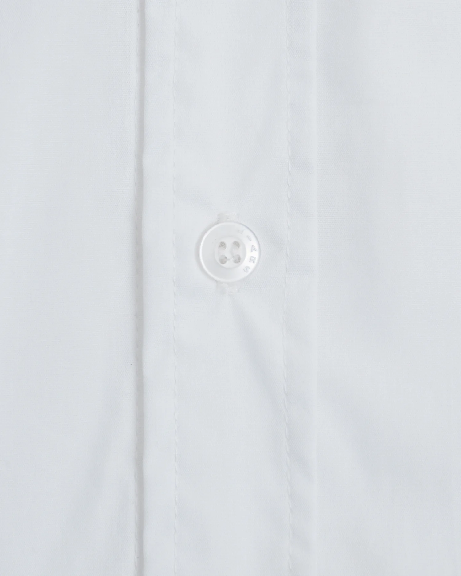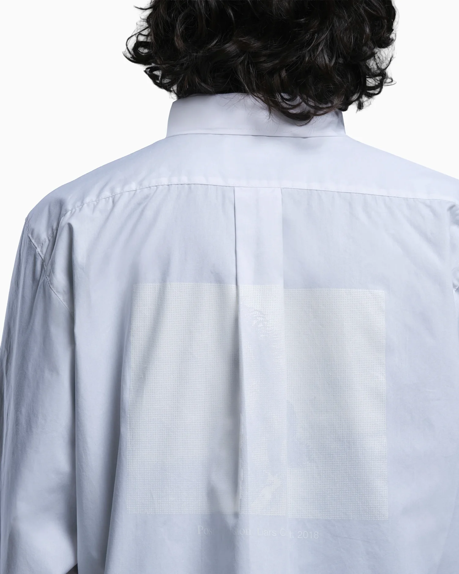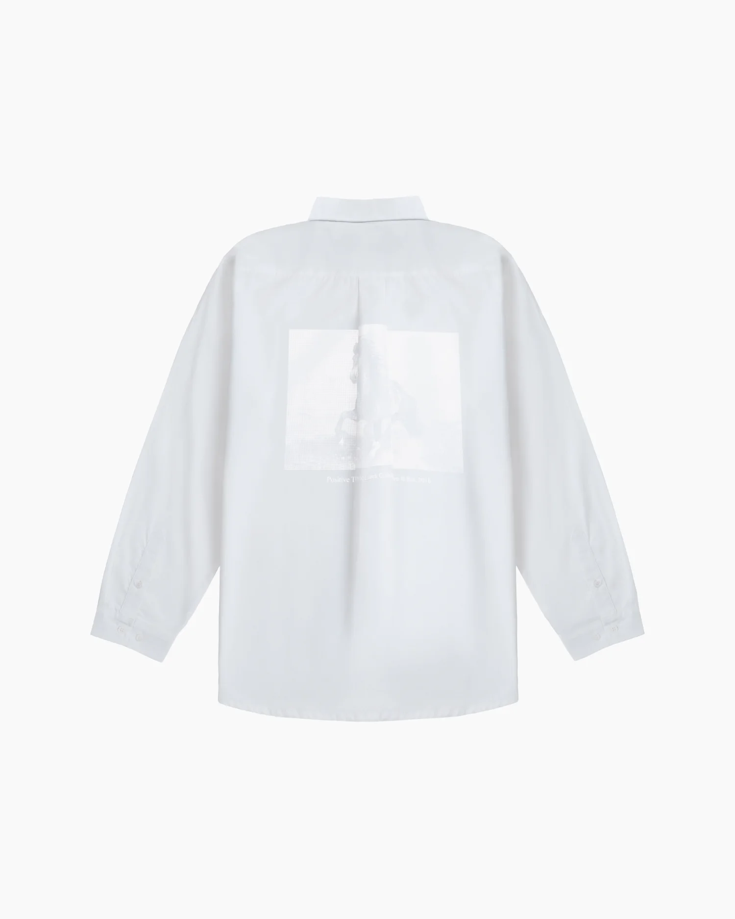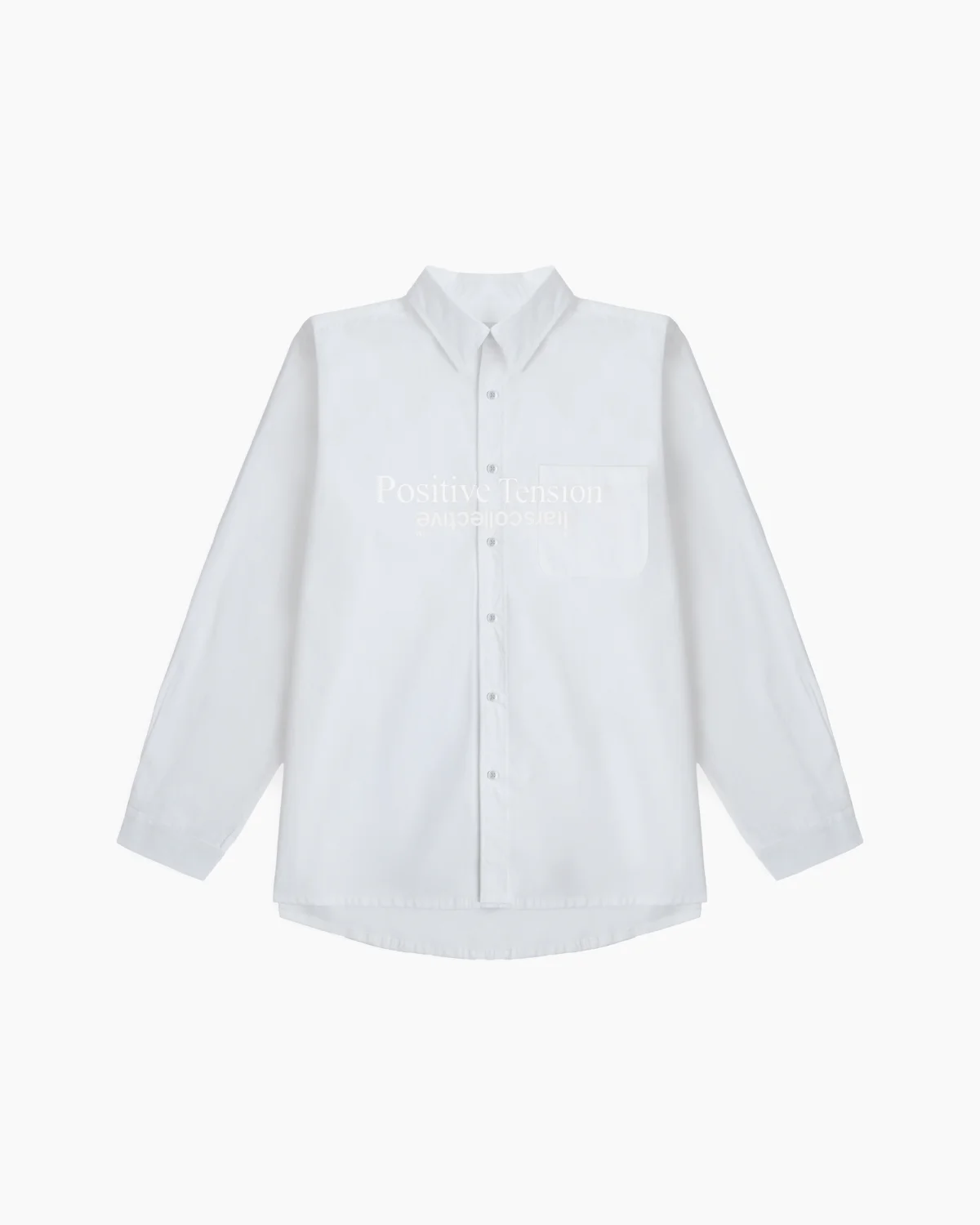 Белая рубашка свободного кроя, выполненная из плотного высококачественного хлопка. Модель отличается деконструированным подходом к брендингу: на передней части расположен инвертированный (перевернутый) текстовый принт «Positive Tension», перекрывающий нагрудный карман и планку. Спинка изделия декорирована масштабным полупрозрачным принтом с изображением скачущей лошади, выполненным в технике растровой графики.