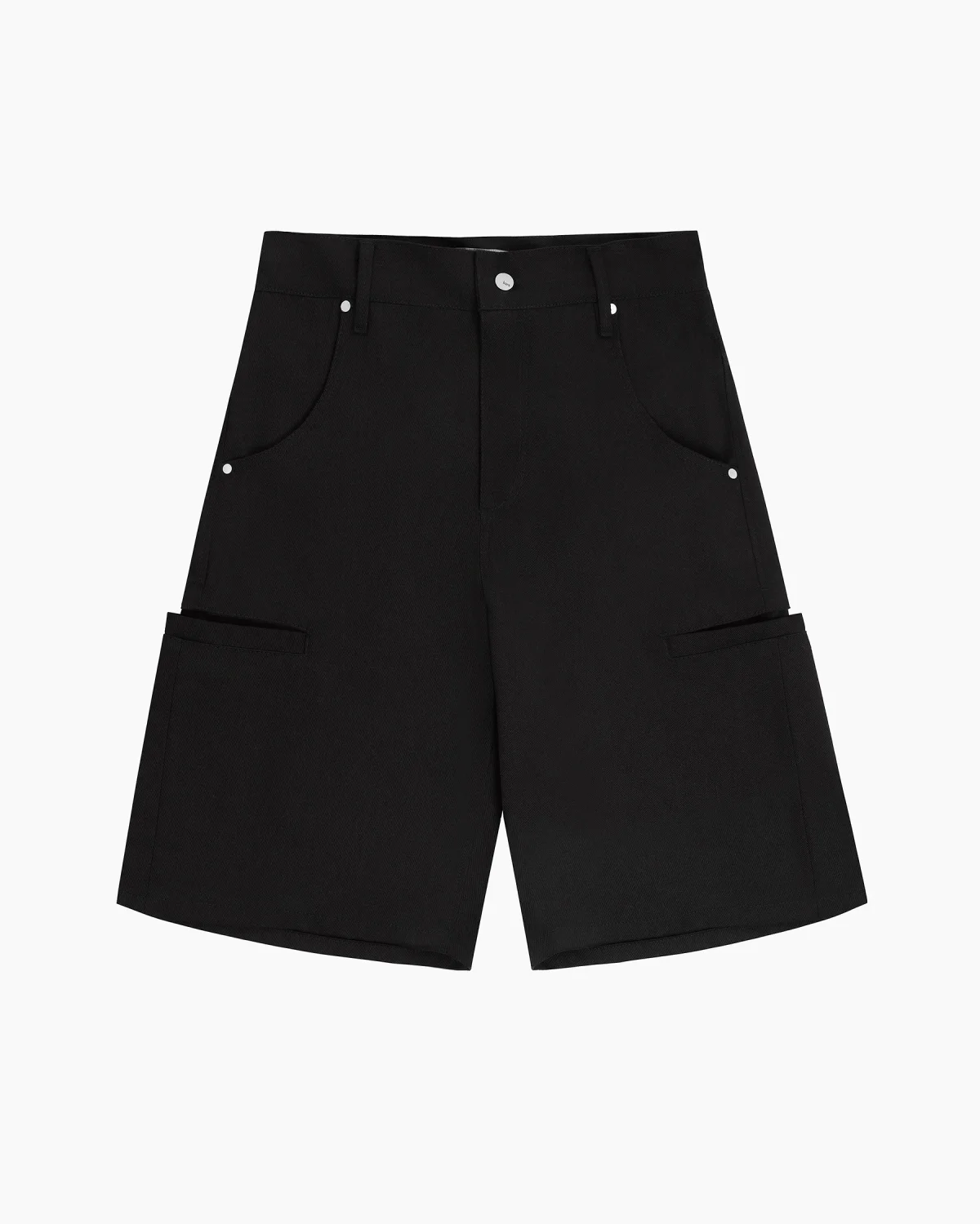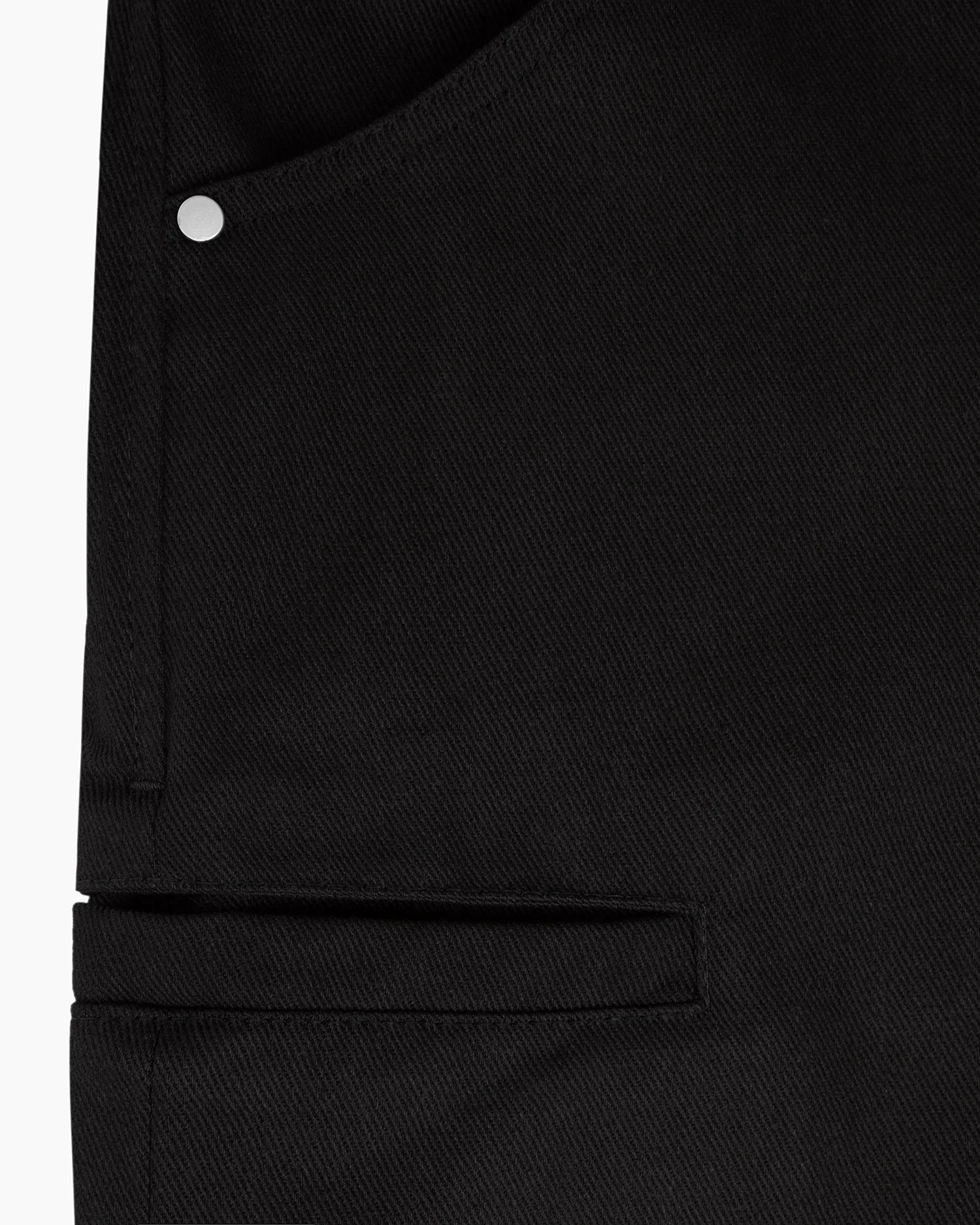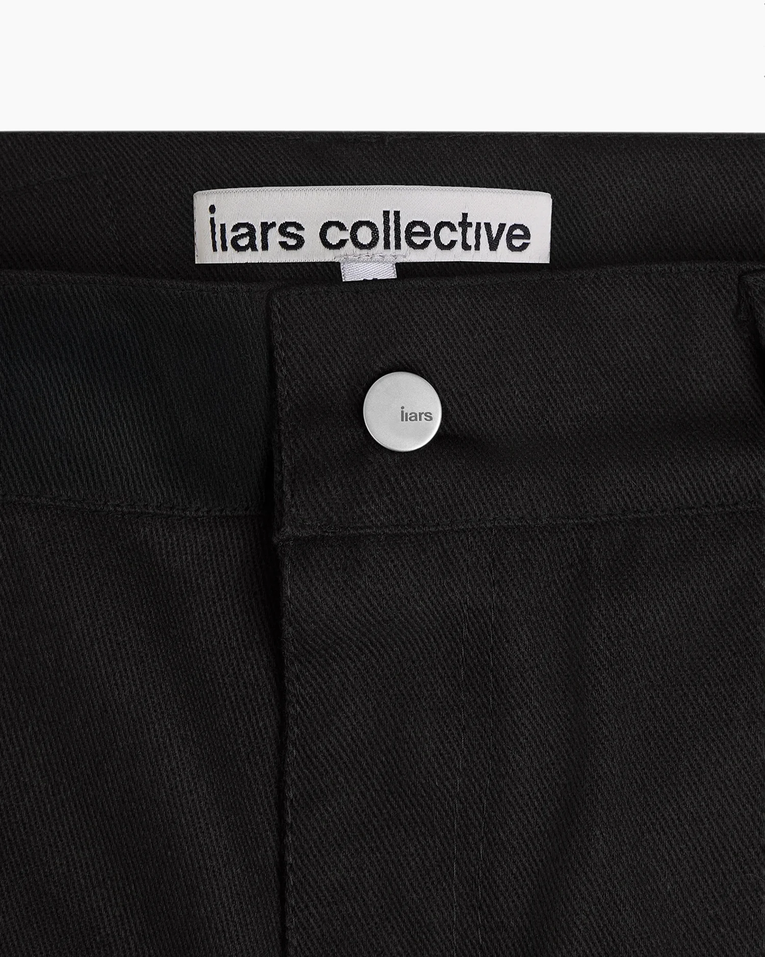 Черные шорты широкого кроя, выполненные из плотного хлопкового канваса, устойчивого к износу. Модель вдохновлена классической рабочей одеждой и отличается сложной архитектурой карманов: помимо традиционных боковых и задних отсеков, шорты дополнены глубокими накладными карманами в области колен с горизонтальным входом. Металлические заклепки в точках наибольшего напряжения и усиленные швы подчеркивают долговечность изделия. Задняя панель декорирована кожаным патчем Liars Collective в коньячном оттенке. Рекомендация по использованию : В связи с особенностями покраски ткани рекомендуется перед первой ноской постирать в холодной воде (не более 30 градусов ), во избежание окраса вещей светлых тонов.