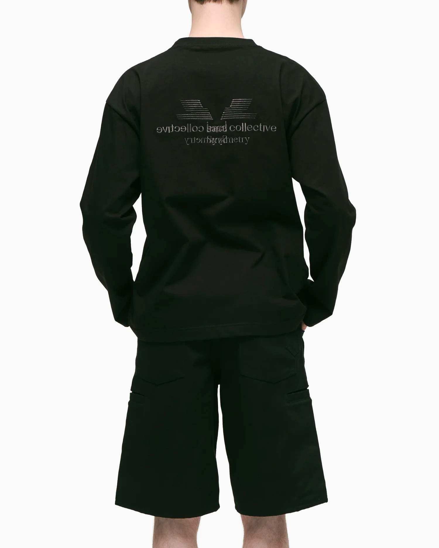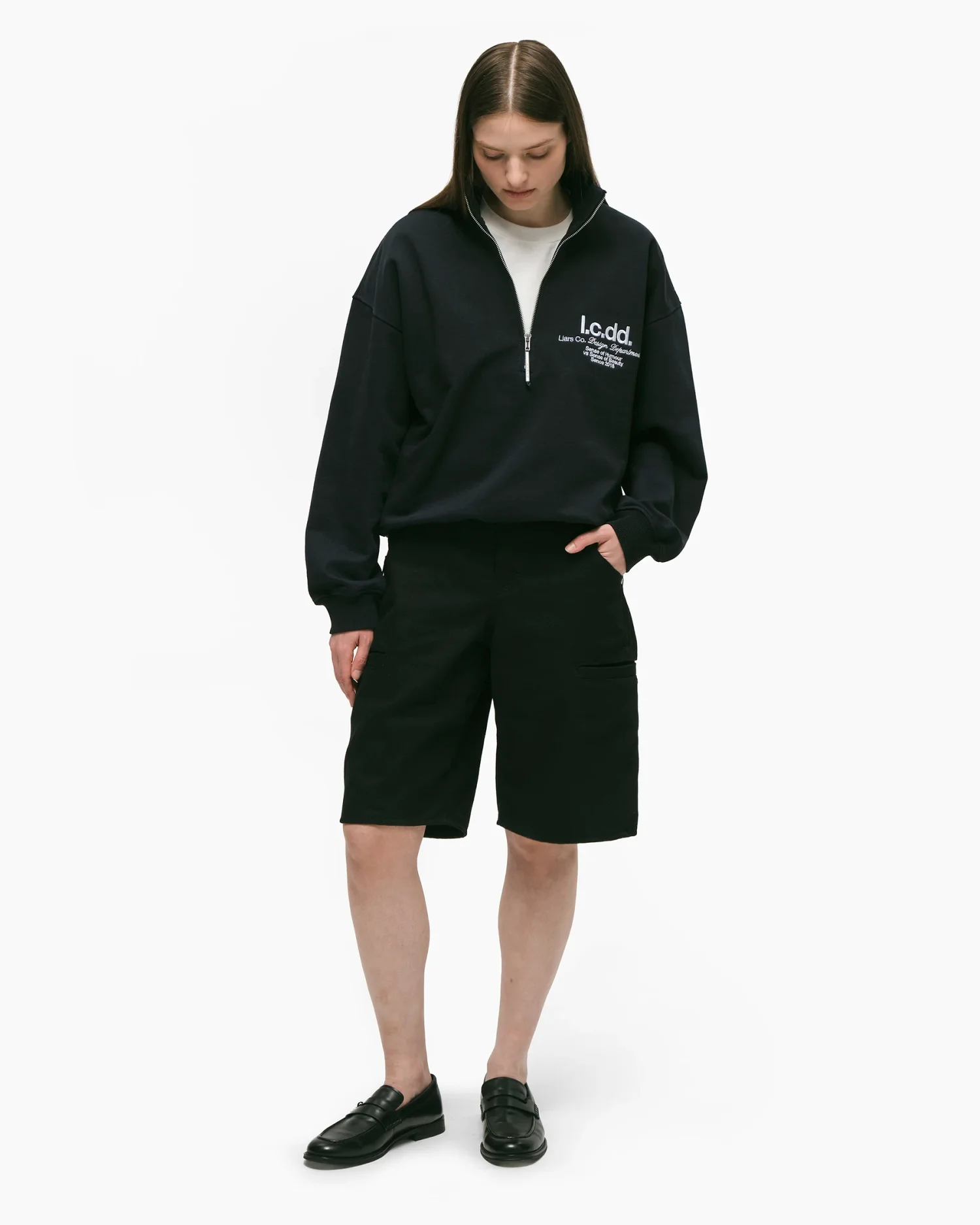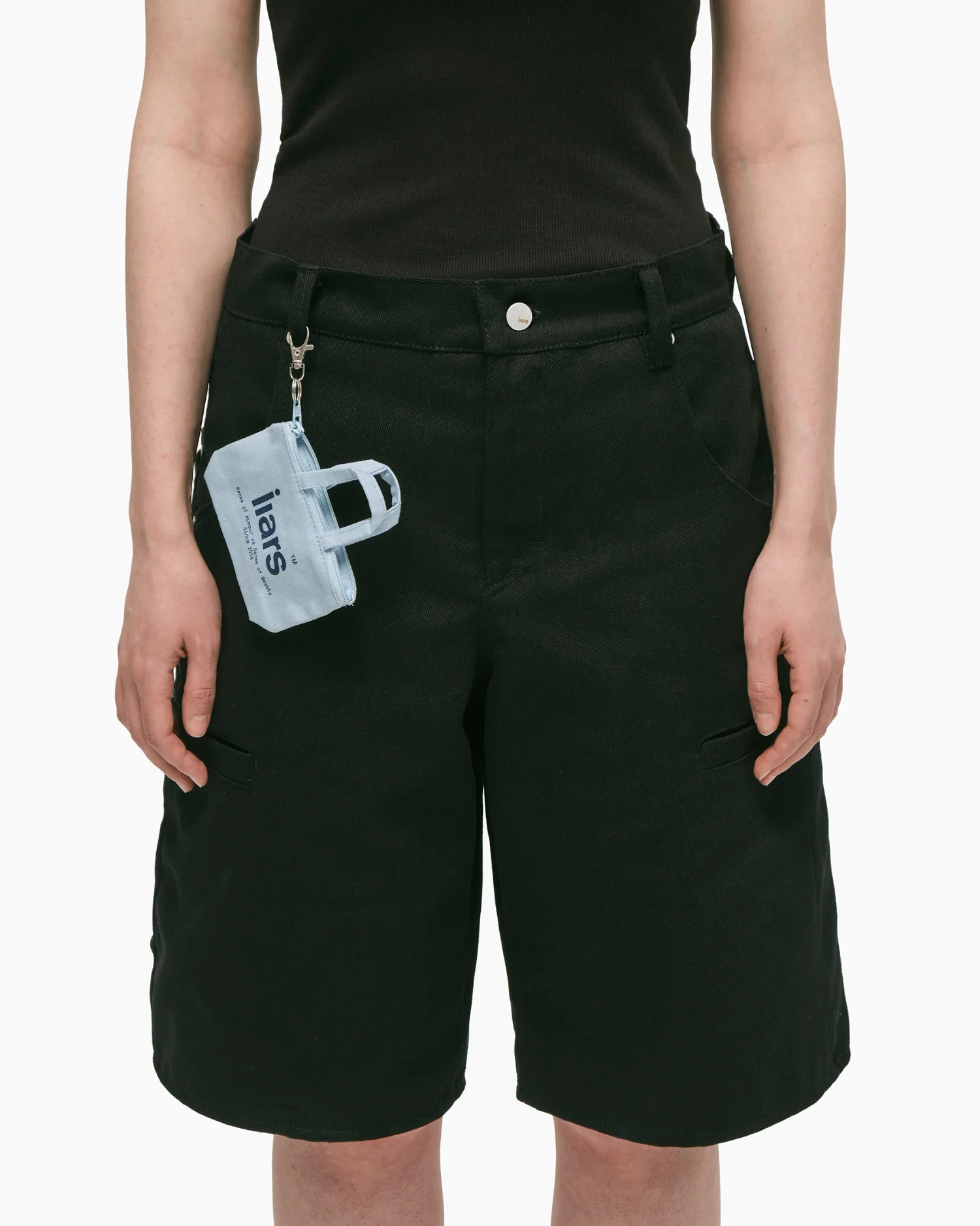 Черные шорты широкого кроя, выполненные из плотного хлопкового канваса, устойчивого к износу. Модель вдохновлена классической рабочей одеждой и отличается сложной архитектурой карманов: помимо традиционных боковых и задних отсеков, шорты дополнены глубокими накладными карманами в области колен с горизонтальным входом. Металлические заклепки в точках наибольшего напряжения и усиленные швы подчеркивают долговечность изделия. Задняя панель декорирована кожаным патчем Liars Collective в коньячном оттенке. Рекомендация по использованию : В связи с особенностями покраски ткани рекомендуется перед первой ноской постирать в холодной воде (не более 30 градусов ), во избежание окраса вещей светлых тонов.