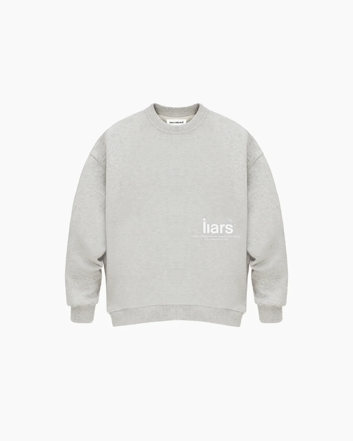 Базовый свитшот свободного кроя в сером цвете, выполненный из плотного премиального хлопкового трикотажа. На груди расположен логотип «liars™», дополненный философией бренда через манифест «THE ACT OF EXPLAINING THE MEANING». На спинке изделия минимальстичная надпись «liars collective™». Подол изделия, горловина и рукавах укреплены эластичными манжетами.
