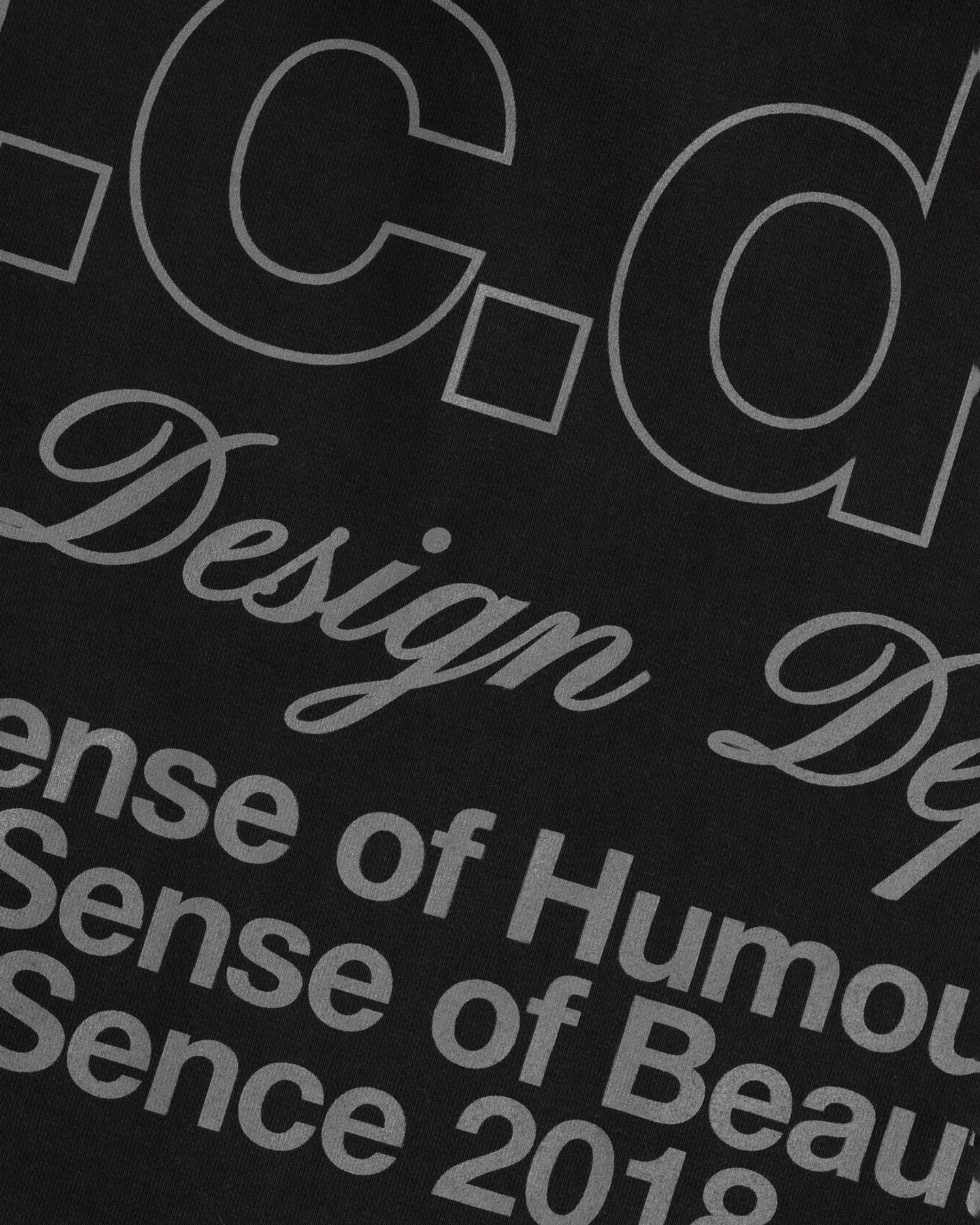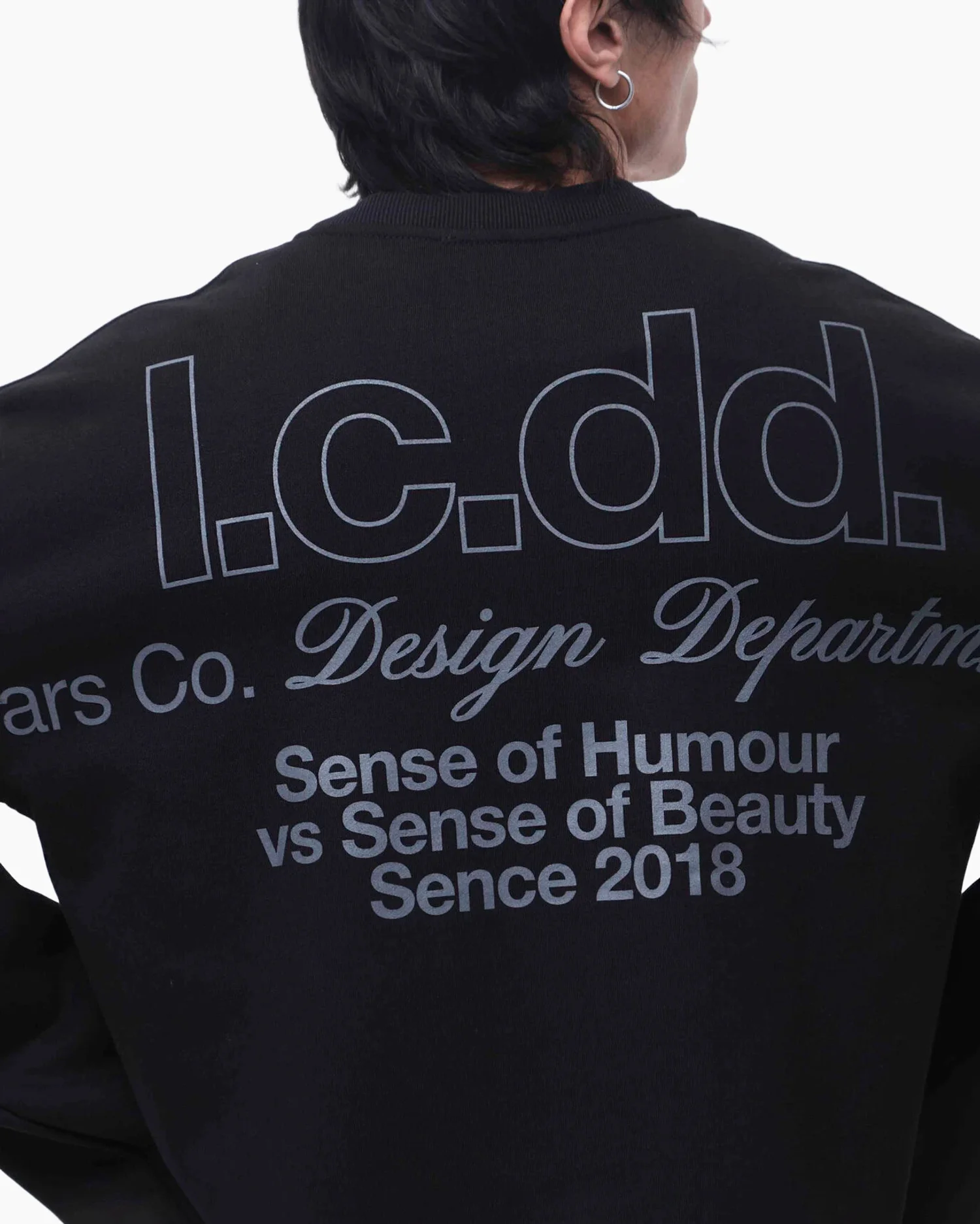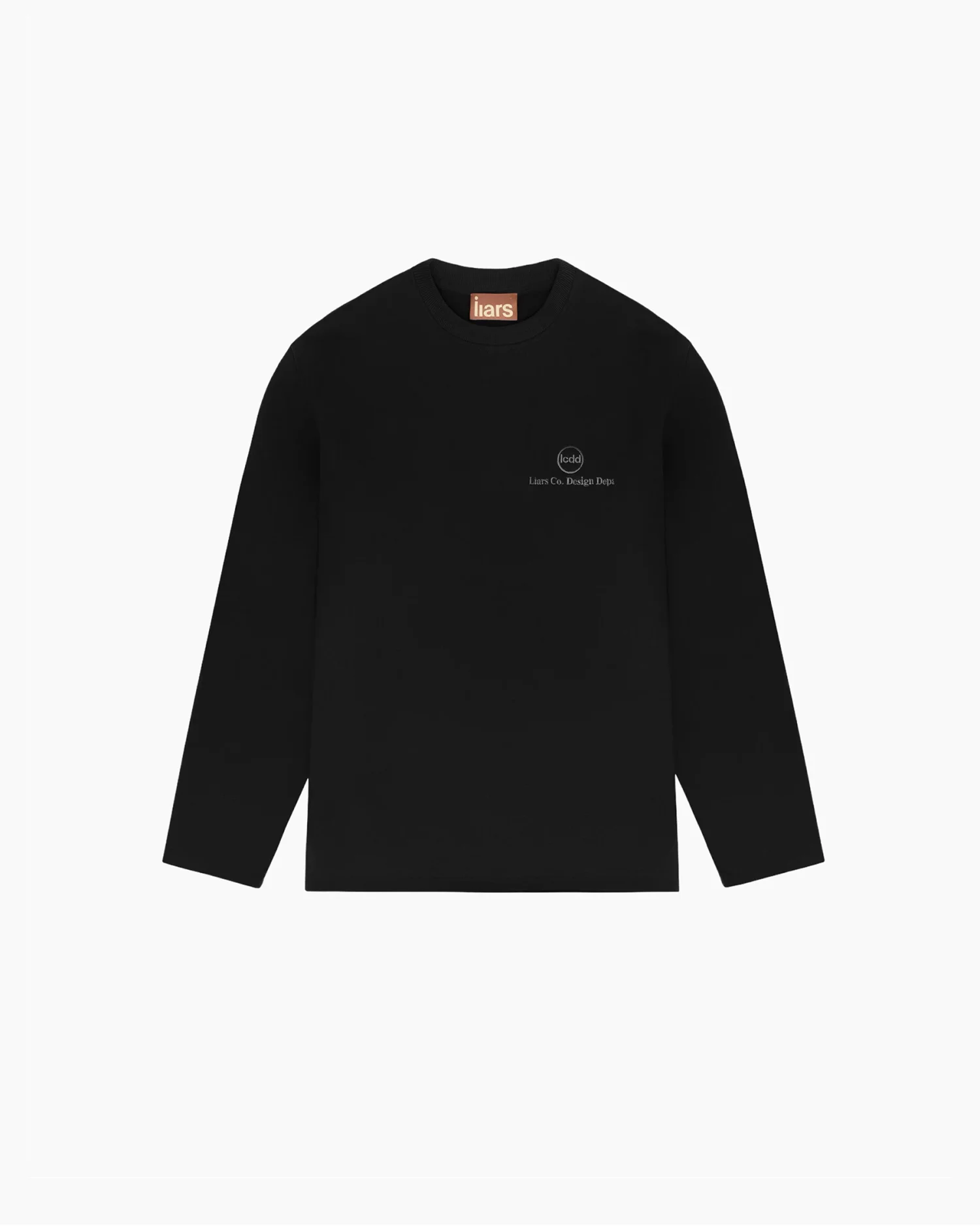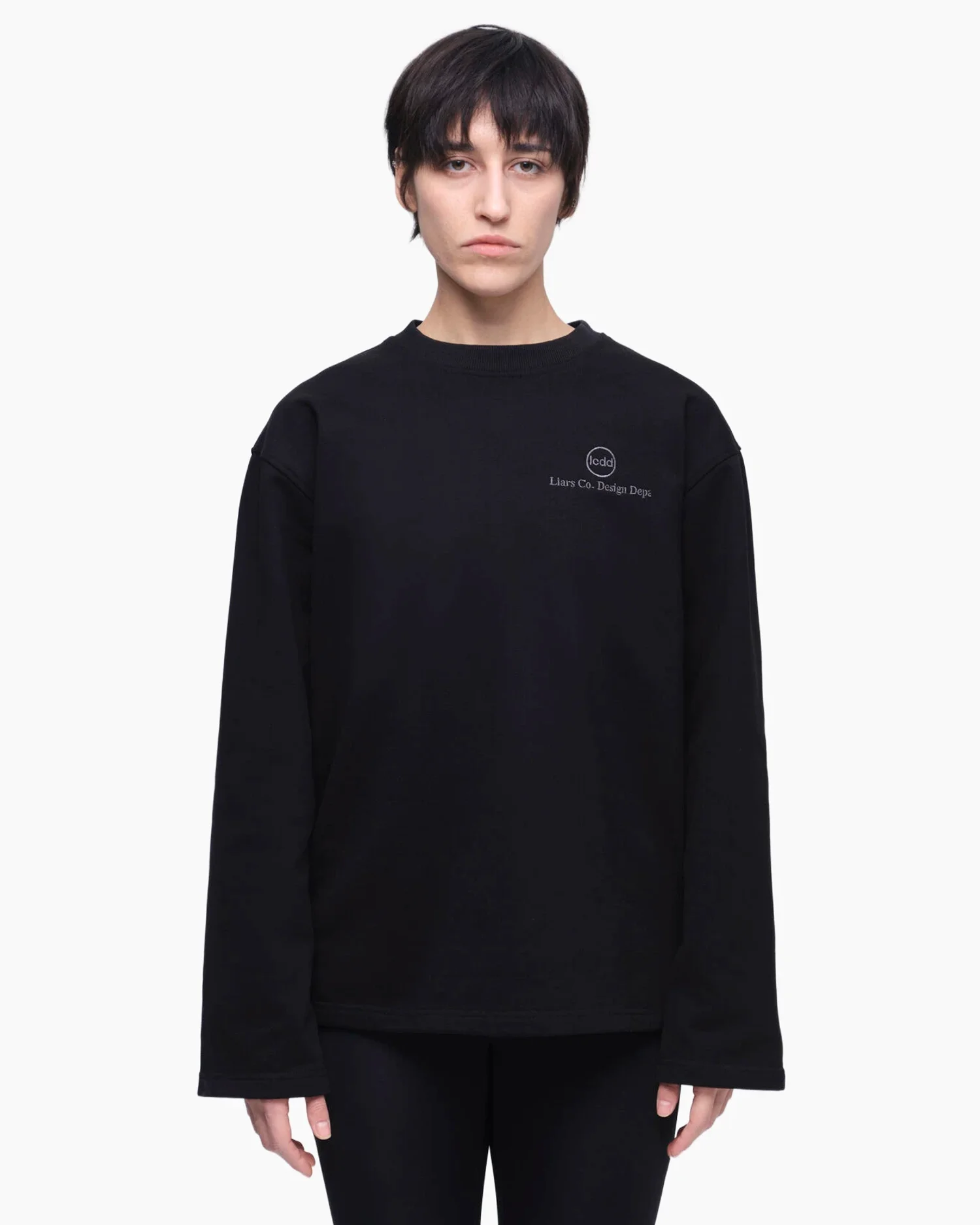 Черный свитшот прямого кроя, выполненный из плотного хлопкового трикотажа с гладкой фактурой. Модель воплощает утилитарную эстетику бренда: на груди расположен деликатный графический элемент — логотип «lcdd» в круге и подпись «Liars Co. Design Dept.», нанесенные светоотражающей или контрастной серой краской. Изделие дополнено эластичным воротником-стойкой и акцентной оранжевой биркой Liars Collective на внутренней части горловины.
