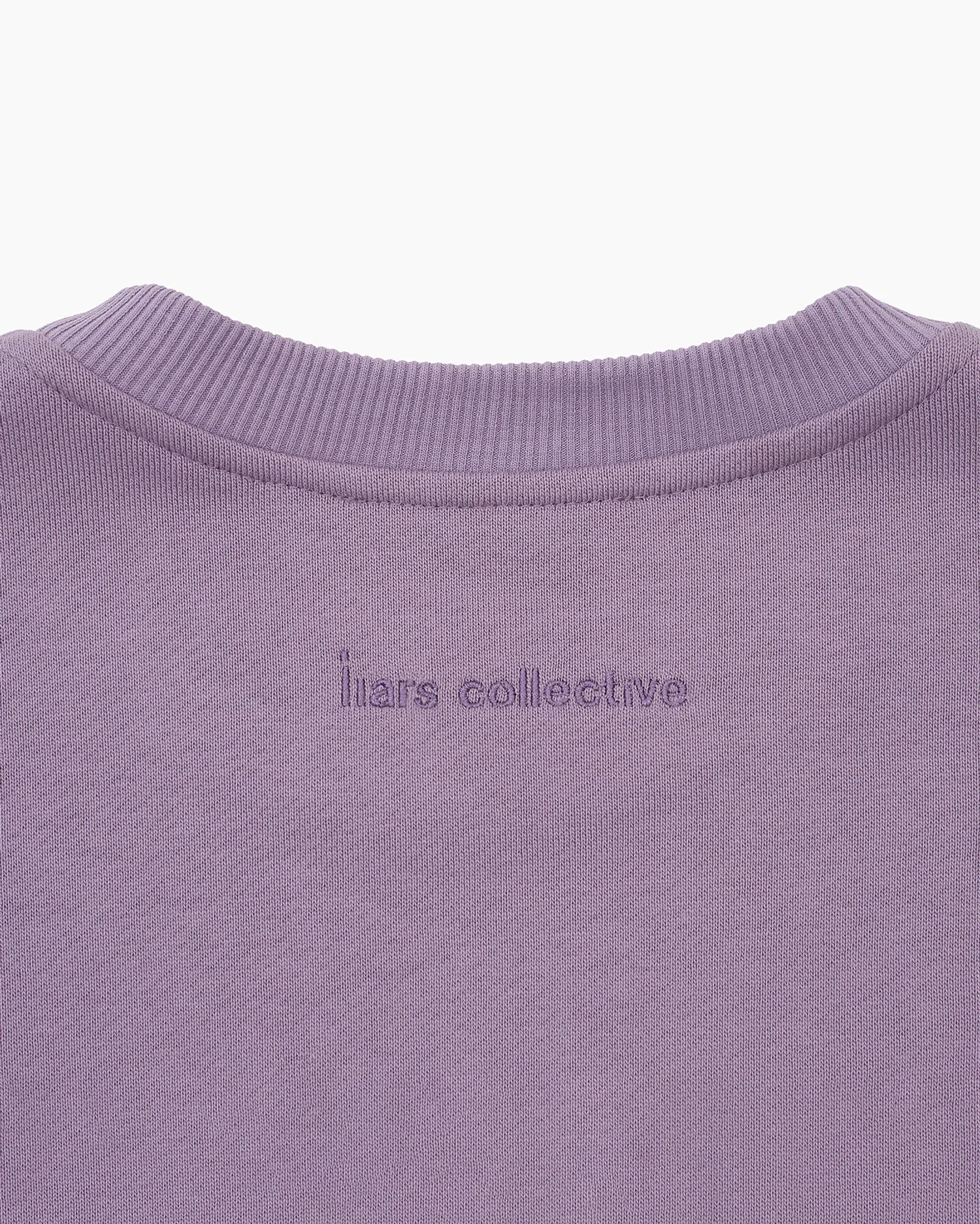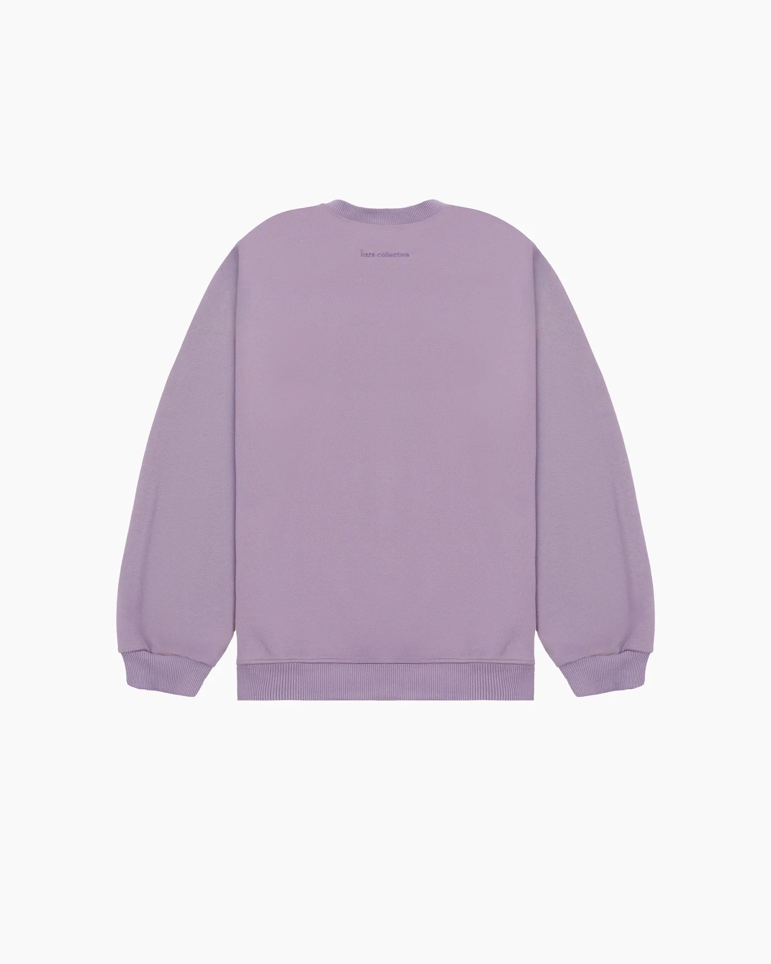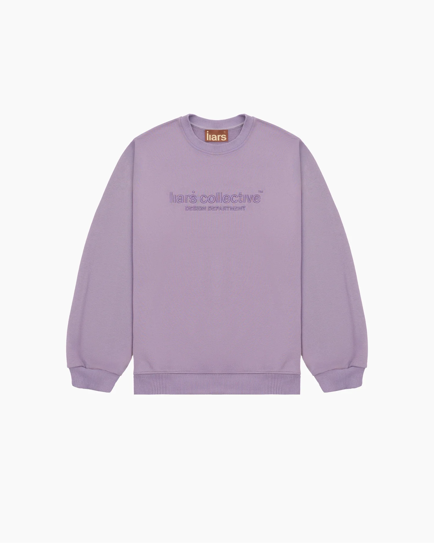 Свитшот свободного кроя в приглушенном лавандовом оттенке, выполненный из плотного хлопкового футера. На груди расположена объемная вышивка «liars collective™ DESIGN DEPARTMENT», выполненная нитью в тон, что создает благородный рельефный эффект. Спинка изделия дополнена минималистичным микро-принтом «liars collective» под воротником. Выверенный оверсайз-силуэт с заниженной линией плеча, глубокими проймами и широкими эластичными манжетами.