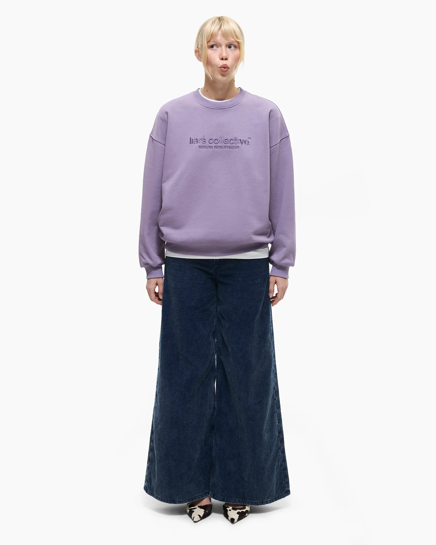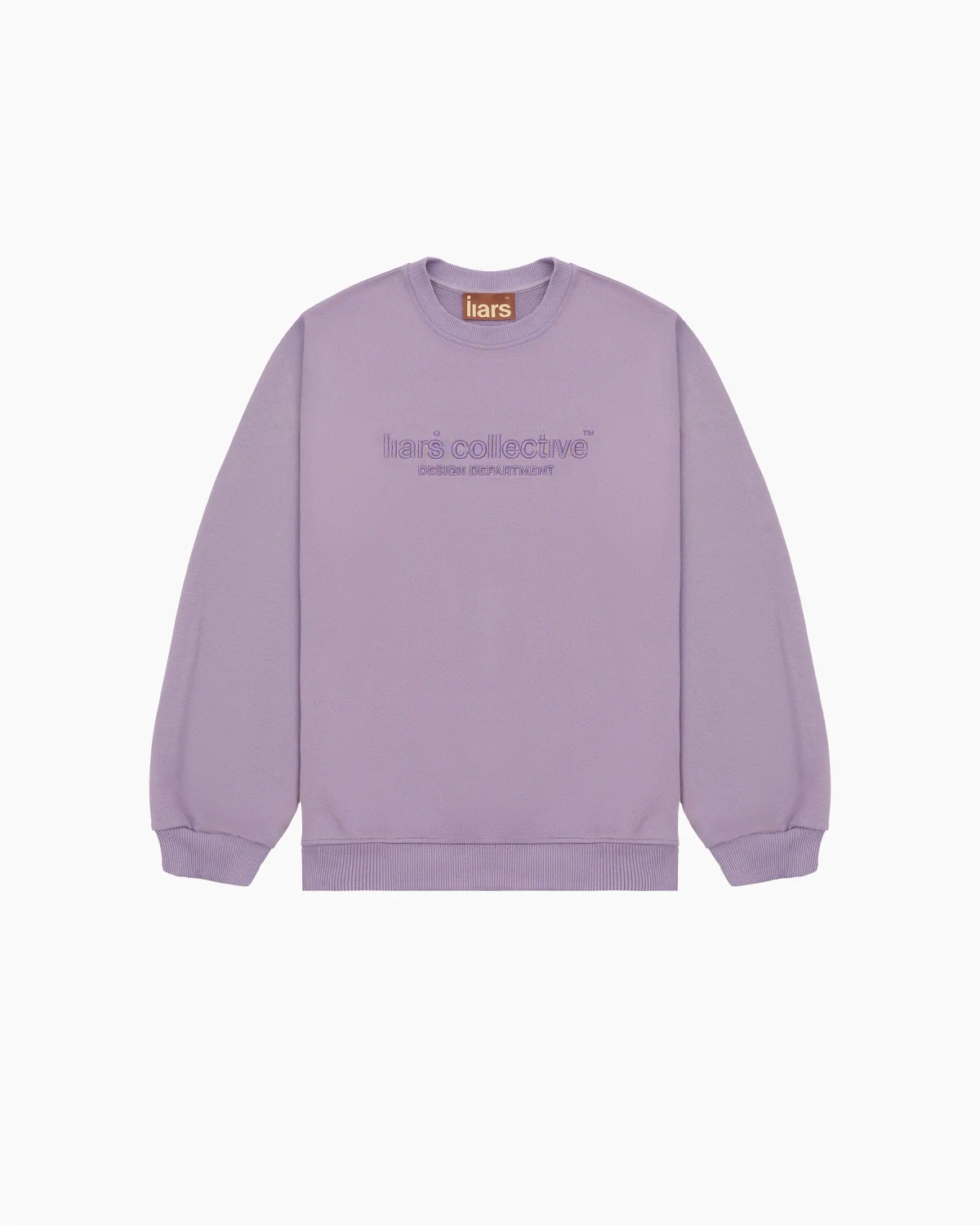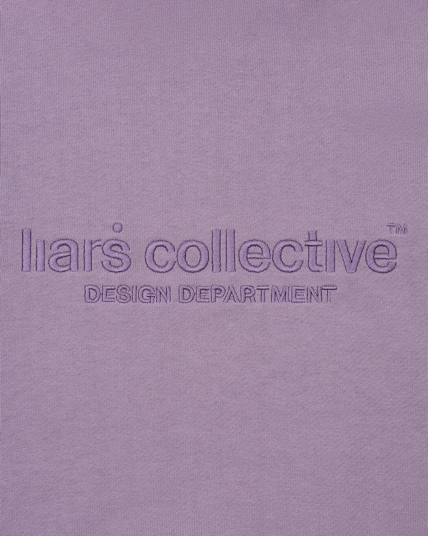 Свитшот свободного кроя в приглушенном лавандовом оттенке, выполненный из плотного хлопкового футера. На груди расположена объемная вышивка «liars collective™ DESIGN DEPARTMENT», выполненная нитью в тон, что создает благородный рельефный эффект. Спинка изделия дополнена минималистичным микро-принтом «liars collective» под воротником. Выверенный оверсайз-силуэт с заниженной линией плеча, глубокими проймами и широкими эластичными манжетами.