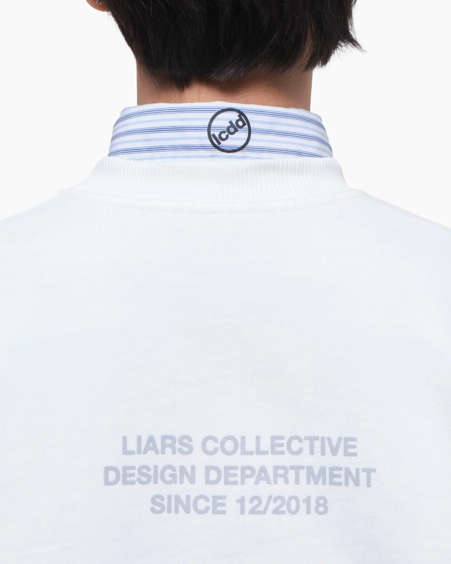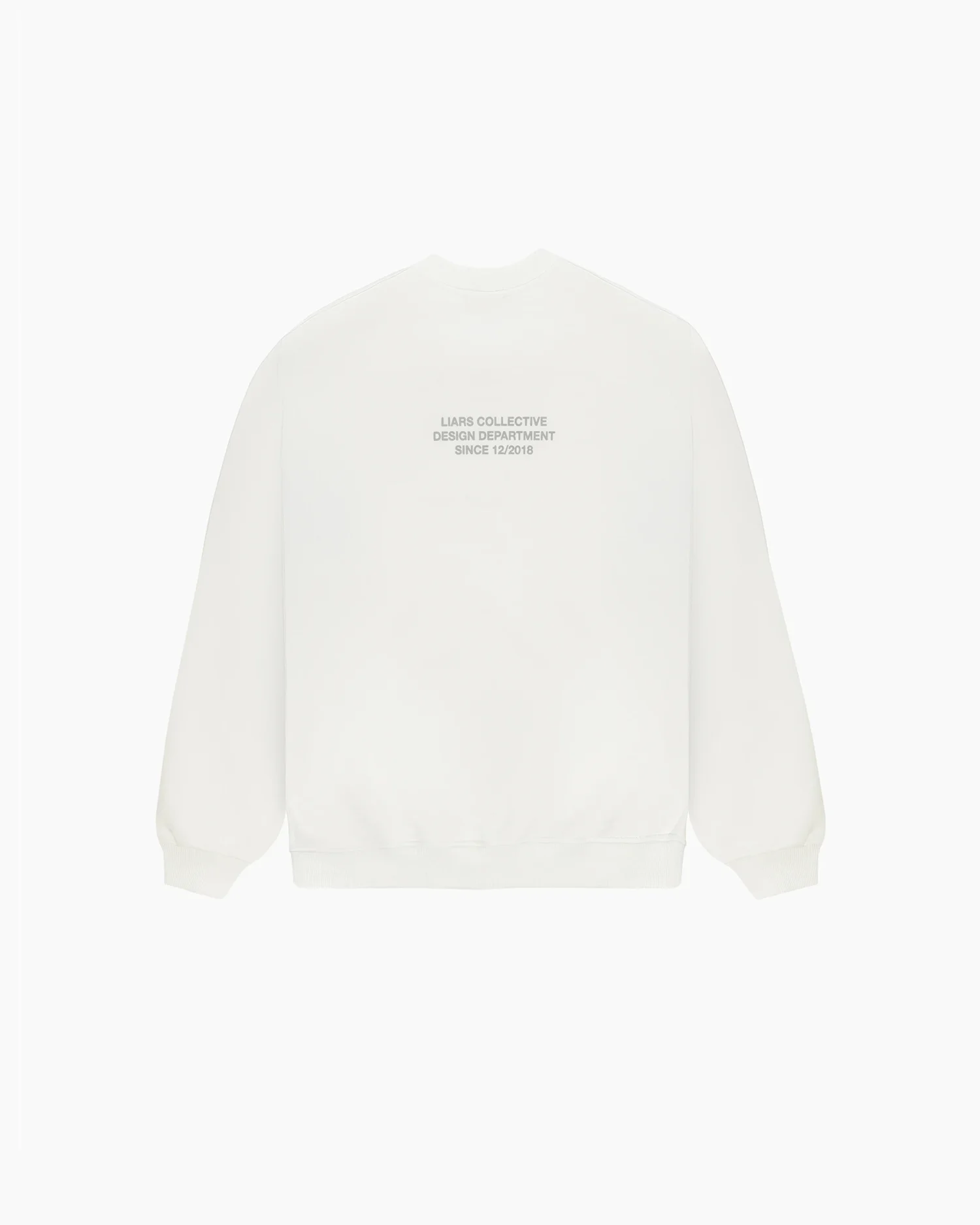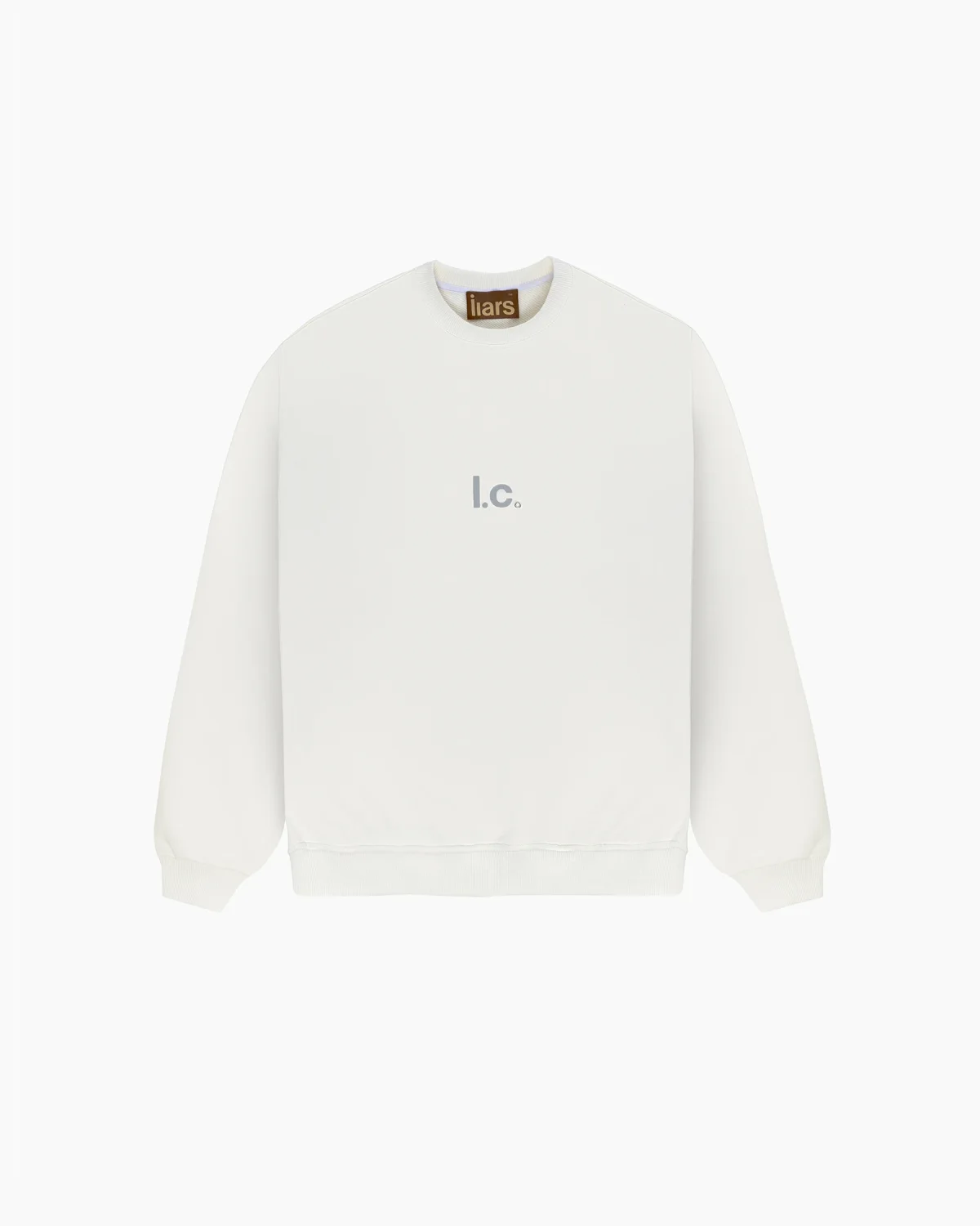 елоснежный свитшот свободного кроя, выполненный из плотного премиального хлопка. Изделие отличается предельной лаконичностью: на груди расположен компактный принт с инициалами бренда «l.c.», выполненный в приглушенном сером цвете. Спинка дополнена аккуратным текстовым блоком «LIARS COLLECTIVE DESIGN DEPARTMENT SINCE 12/2018», подчеркивающим преемственность и архивный характер коллекции. Глубокий объемный силуэт, заниженная линия плеча и широкие эластичные манжеты.