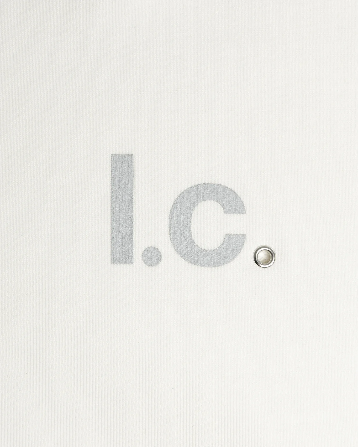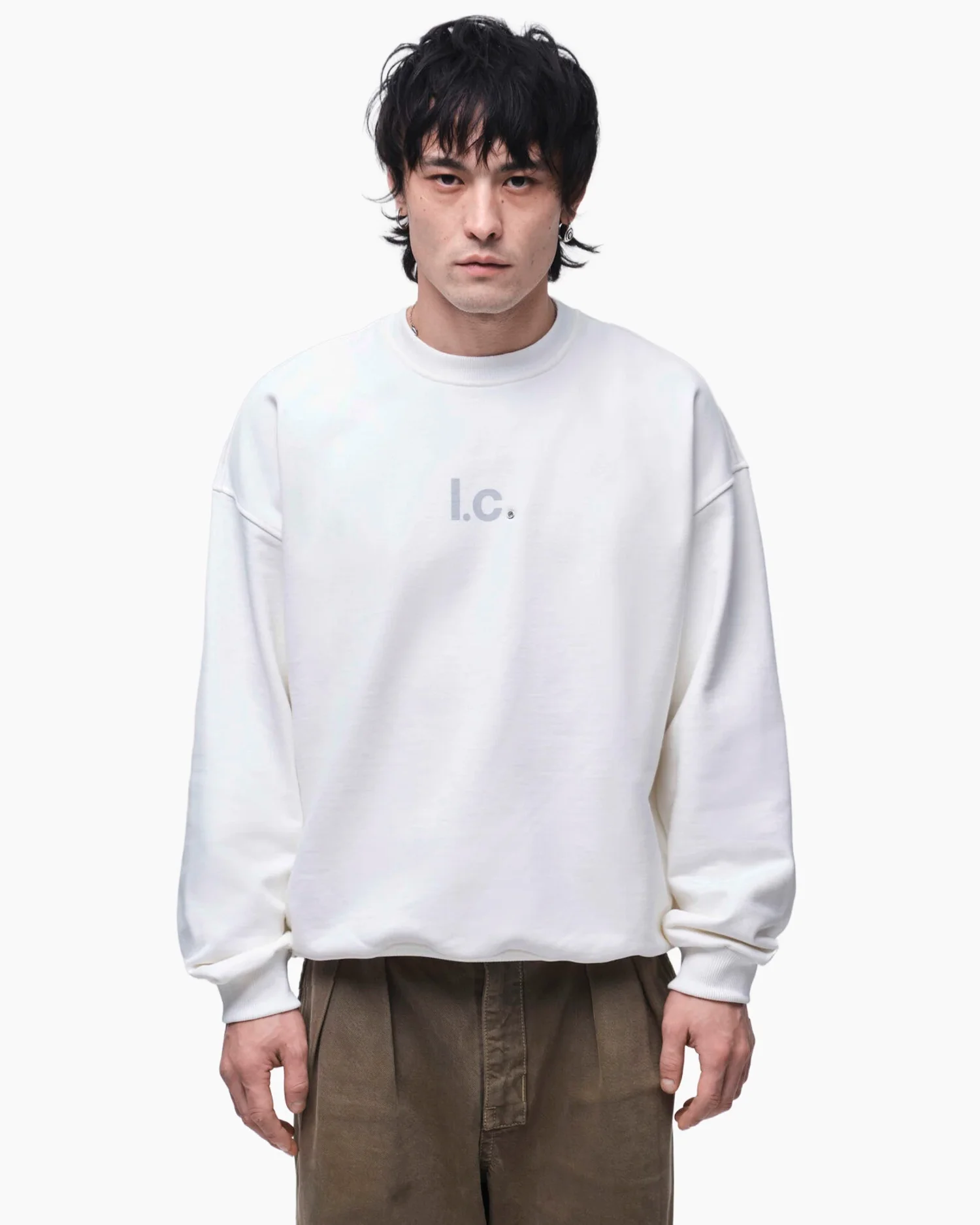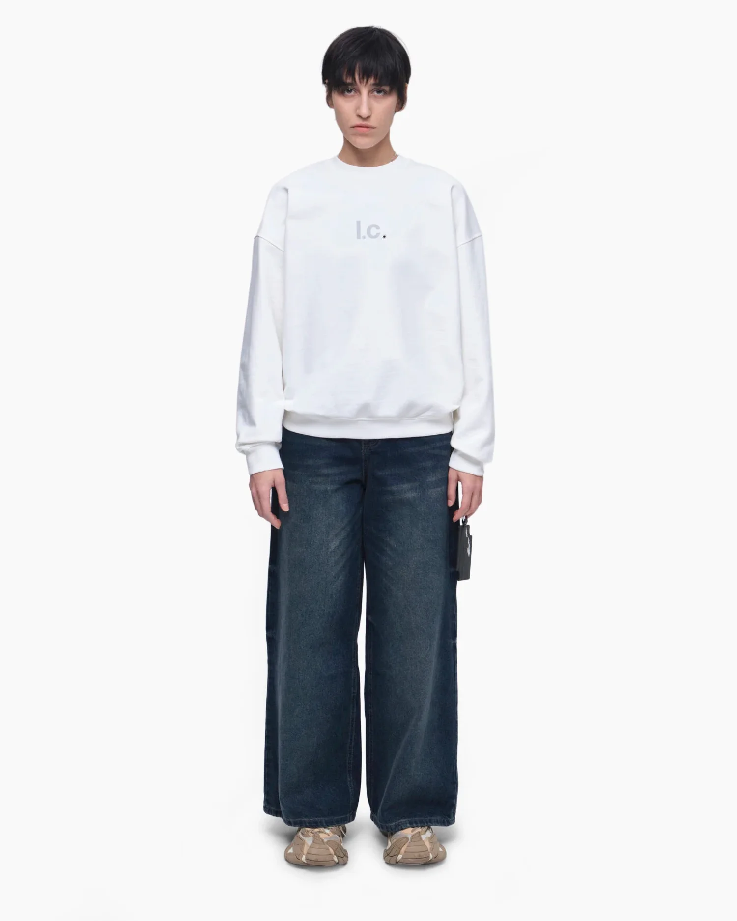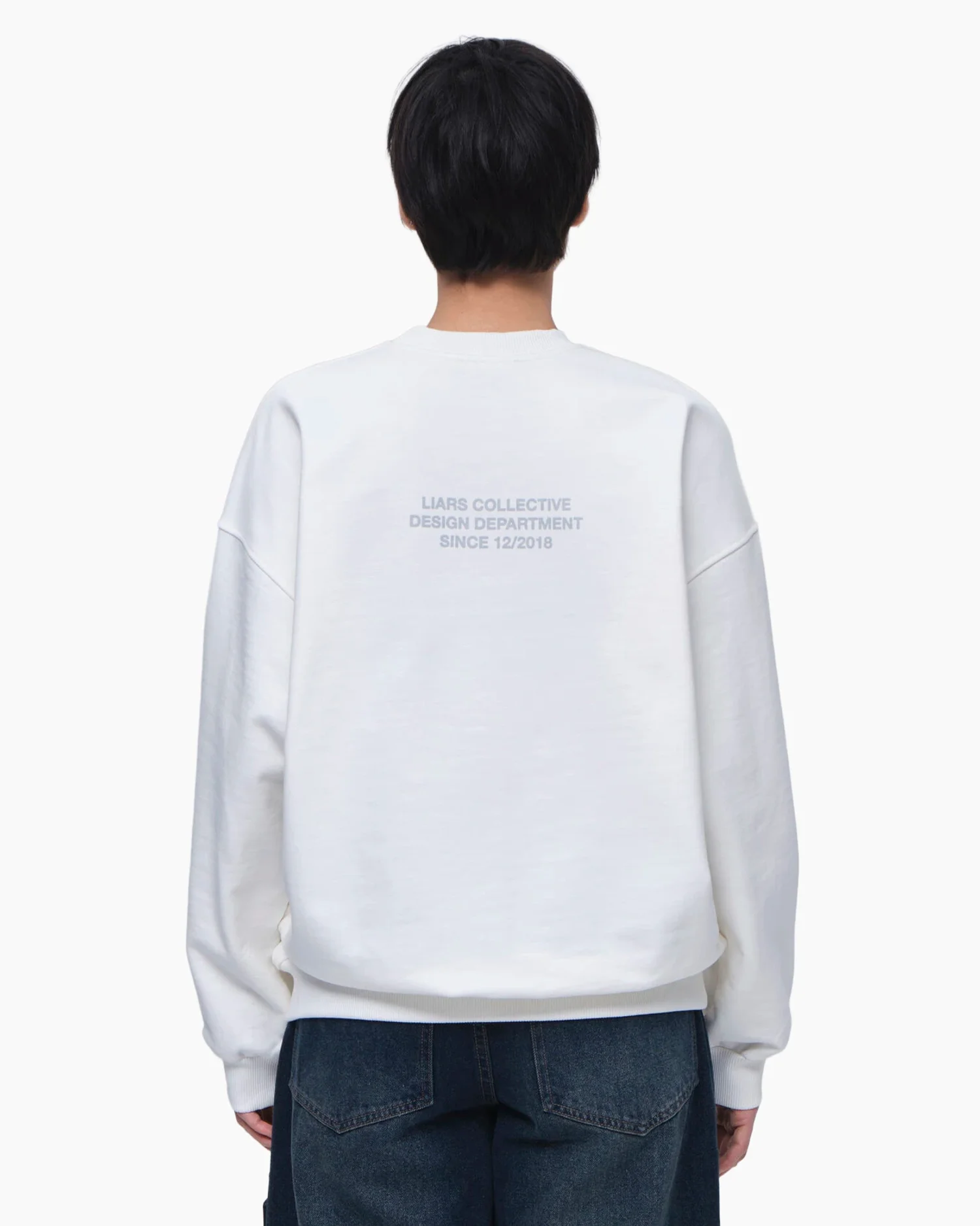 елоснежный свитшот свободного кроя, выполненный из плотного премиального хлопка. Изделие отличается предельной лаконичностью: на груди расположен компактный принт с инициалами бренда «l.c.», выполненный в приглушенном сером цвете. Спинка дополнена аккуратным текстовым блоком «LIARS COLLECTIVE DESIGN DEPARTMENT SINCE 12/2018», подчеркивающим преемственность и архивный характер коллекции. Глубокий объемный силуэт, заниженная линия плеча и широкие эластичные манжеты.