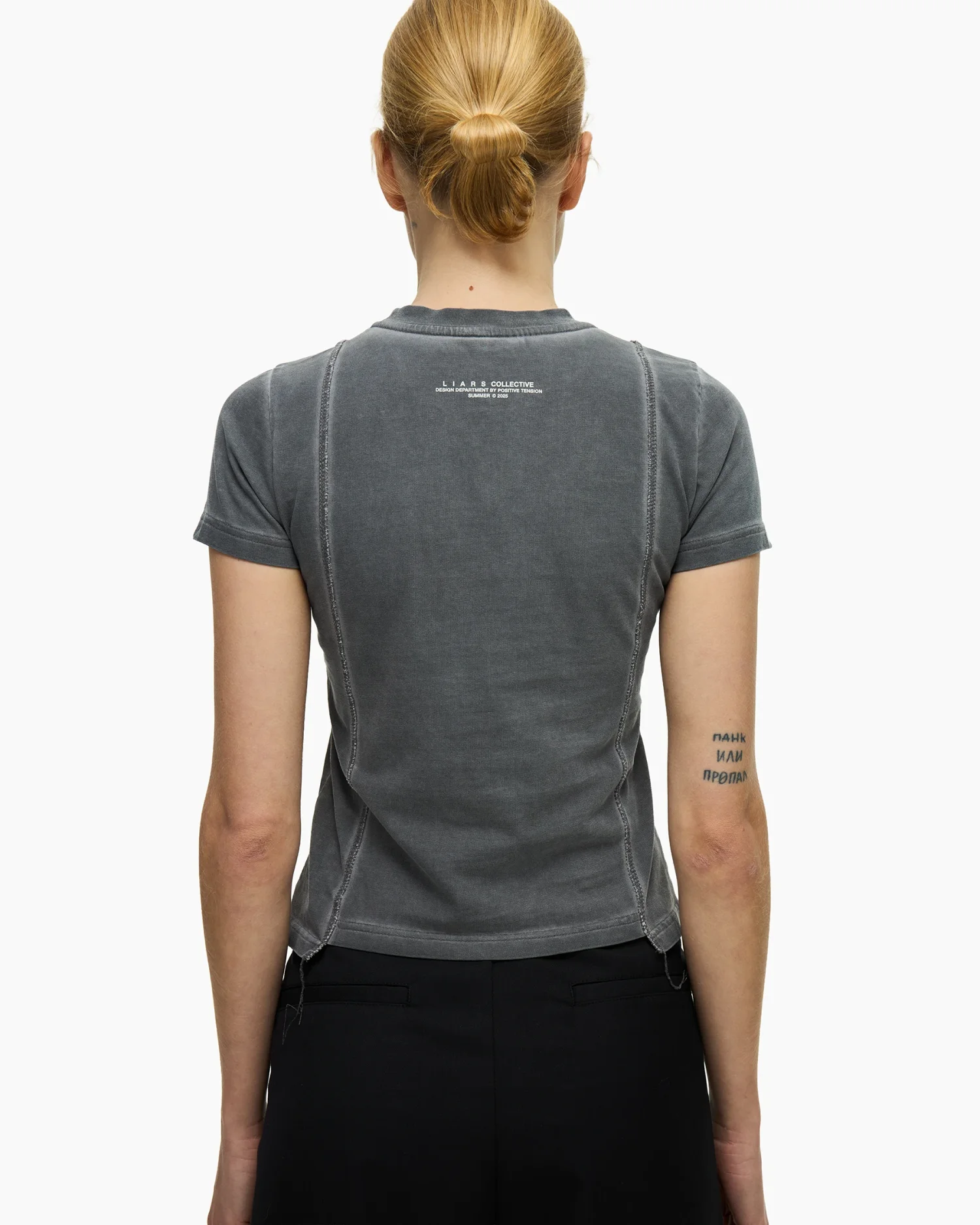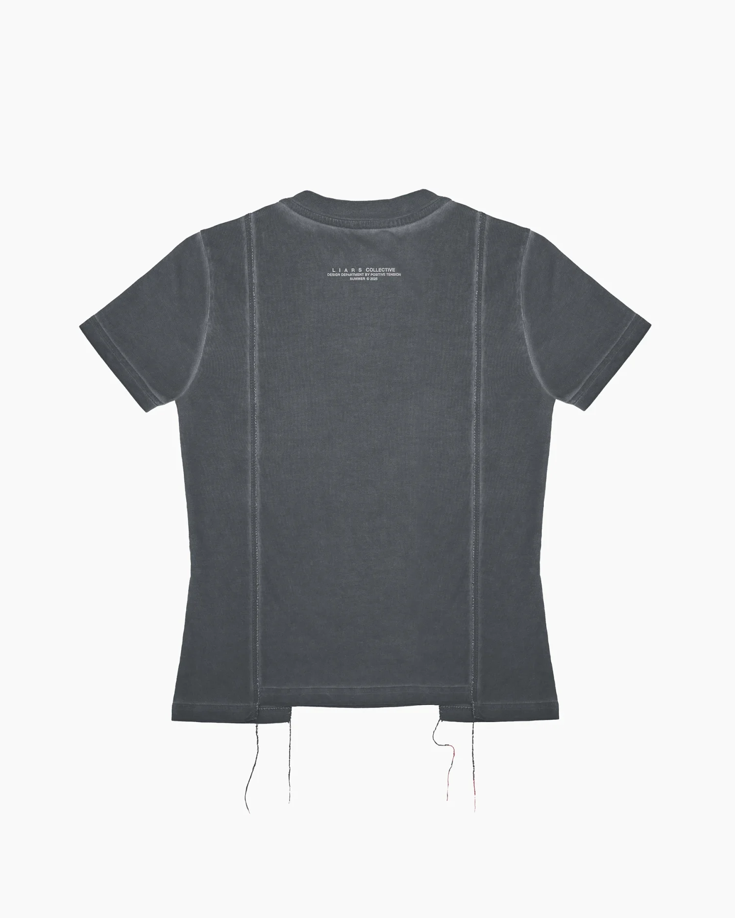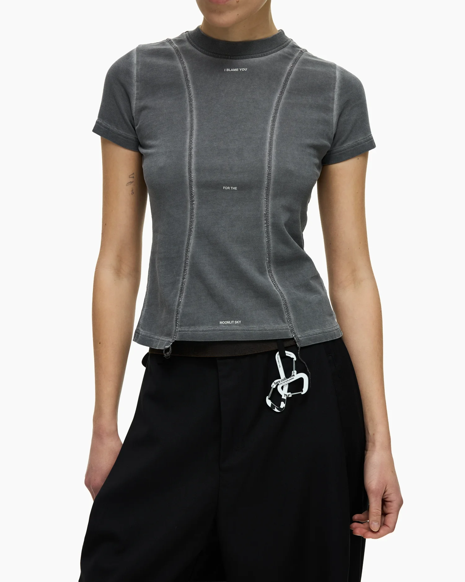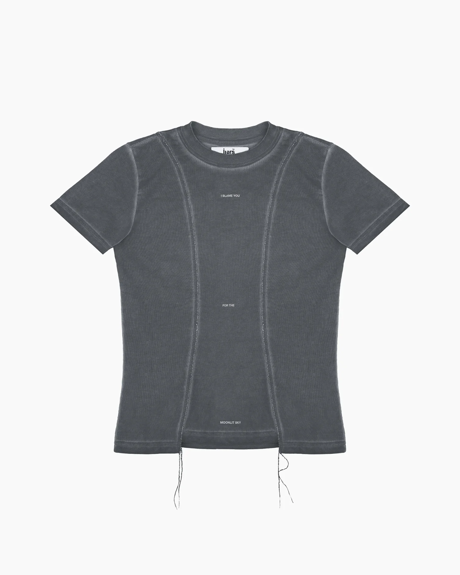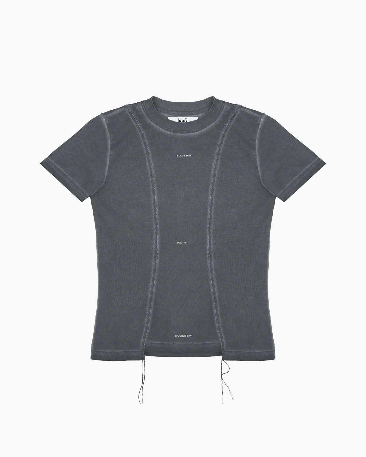 Приталенная футболка в сером оттенке с выраженным эффектом варки, придающим изделию винтажный вид. Дизайн строится на деконструированных элементах: передняя панель оформлена рельефными вертикальными швами с открытыми срезами и декоративными нитями, выходящими за нижний край. Центр изделия украшен деликатным микро-текстом «I BLAME YOU FOR THE MOONLIT SKY», расположенным по вертикали. Плотный эластичный хлопок обеспечивает идеальную посадку по фигуре, сохраняя при этом четкость линий