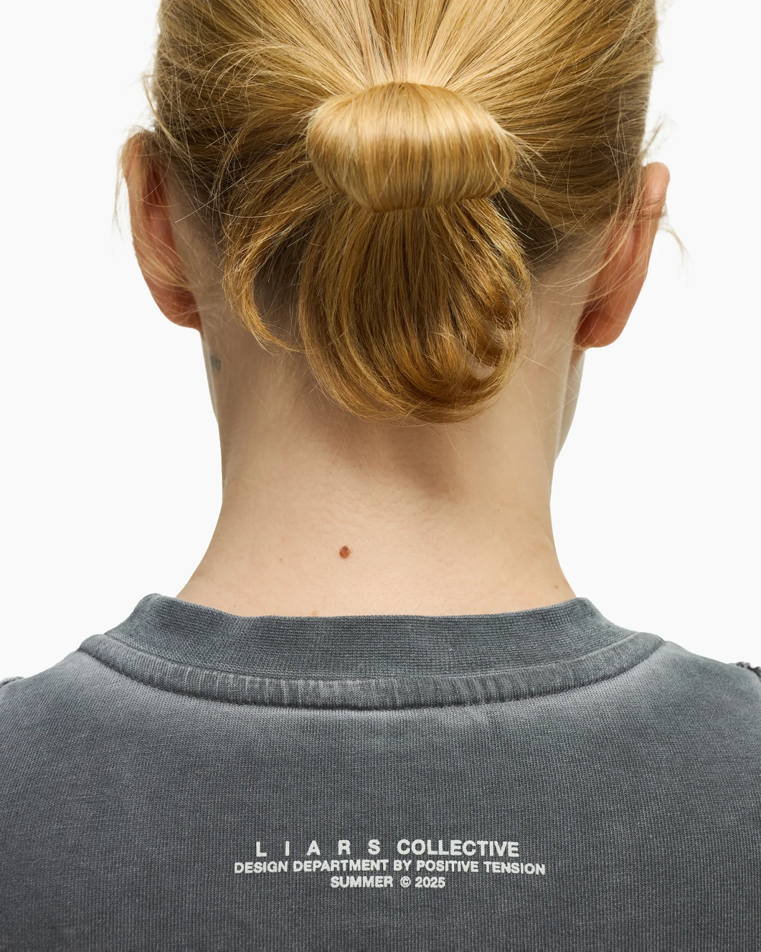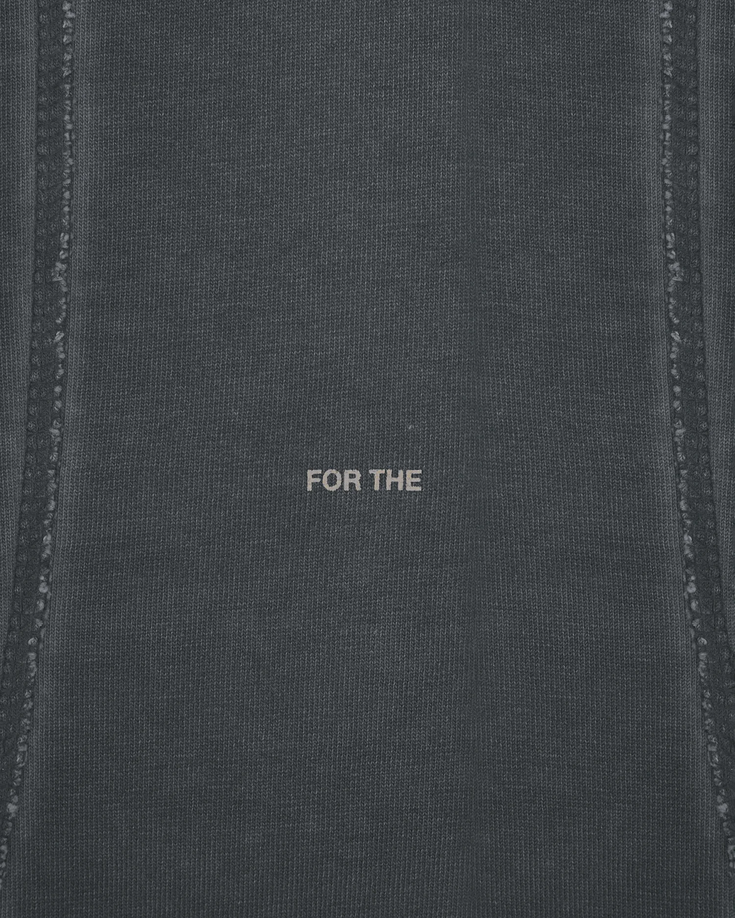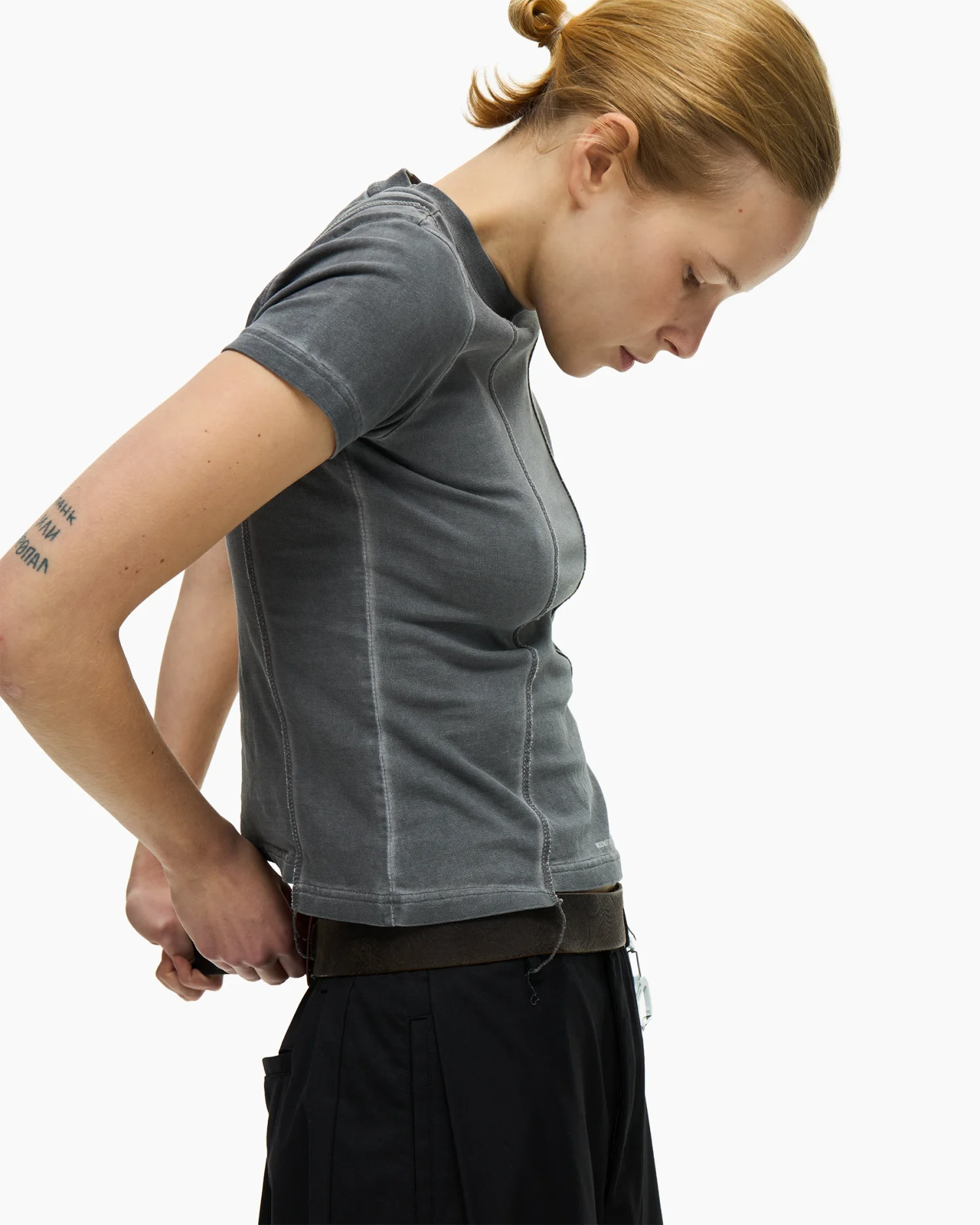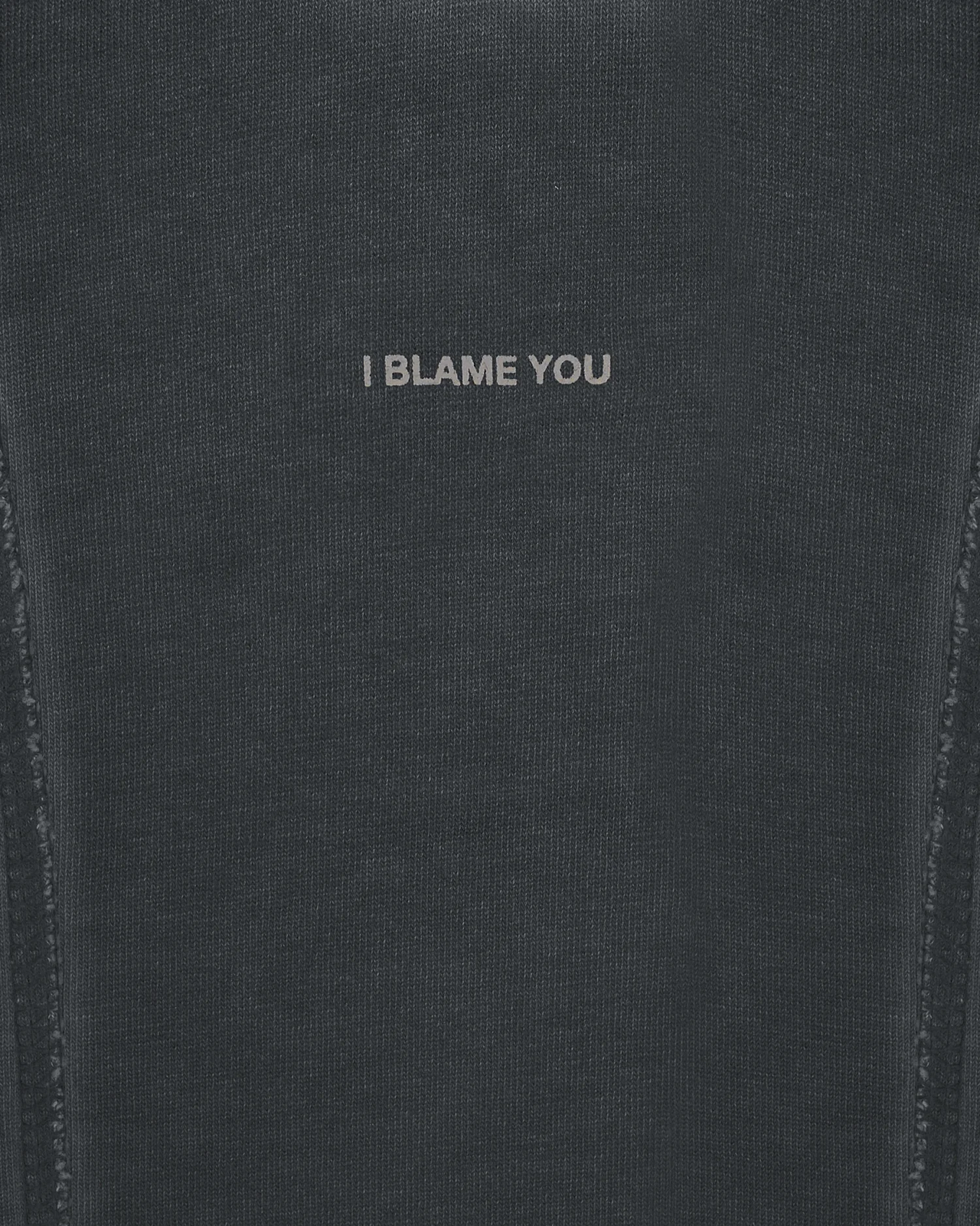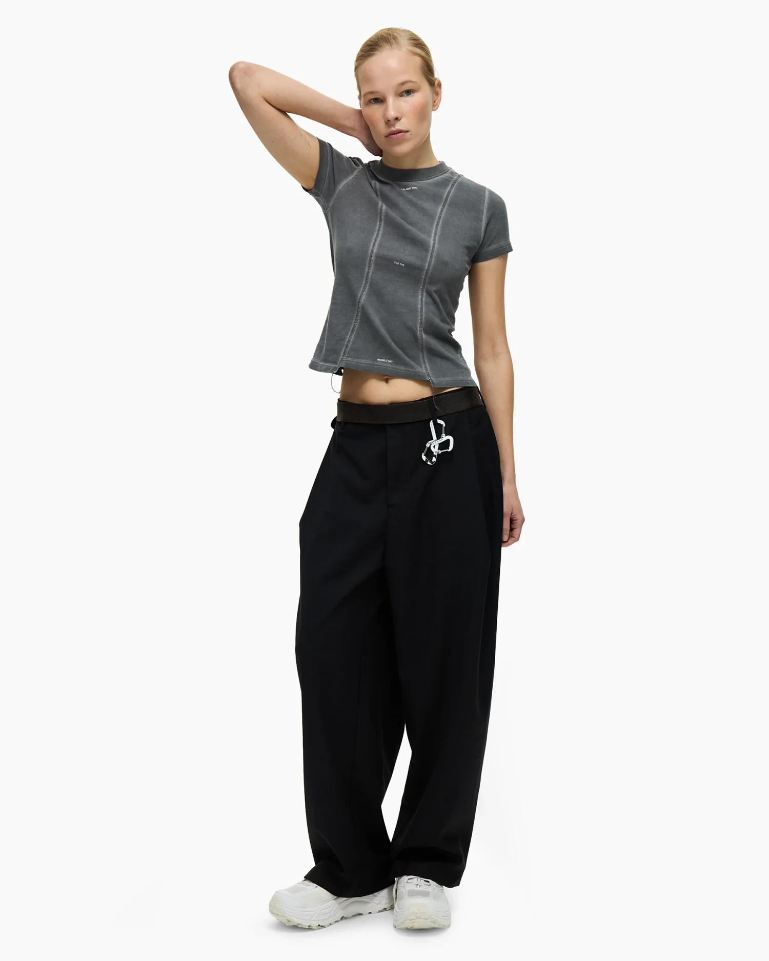 Приталенная футболка в сером оттенке с выраженным эффектом варки, придающим изделию винтажный вид. Дизайн строится на деконструированных элементах: передняя панель оформлена рельефными вертикальными швами с открытыми срезами и декоративными нитями, выходящими за нижний край. Центр изделия украшен деликатным микро-текстом «I BLAME YOU FOR THE MOONLIT SKY», расположенным по вертикали. Плотный эластичный хлопок обеспечивает идеальную посадку по фигуре, сохраняя при этом четкость линий