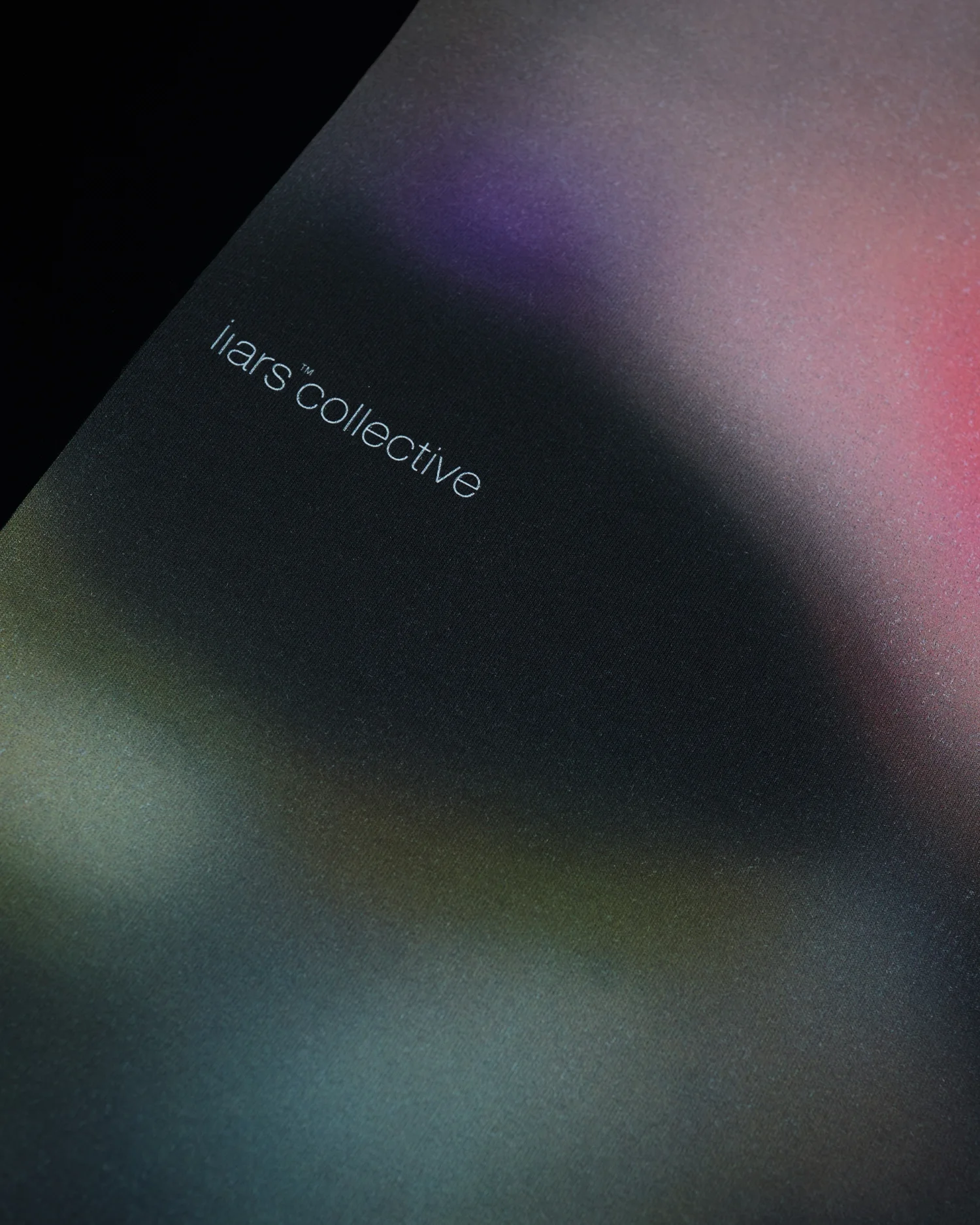Черная хлопковая футболка свободного кроя с заниженной линией плеча. Спинку изделия украшает крупный прямоугольный принт с абстрактным градиентом в приглушенных тонах с ярким розовым акцентом в центре. Лаконичный логотип Liars Collective интегрирован непосредственно в графику. Передняя часть дополнена минималистичным текстовым блоком в нижней левой секции, раскрывающим философский подтекст коллекции. Плотный трикотаж премиального качества.