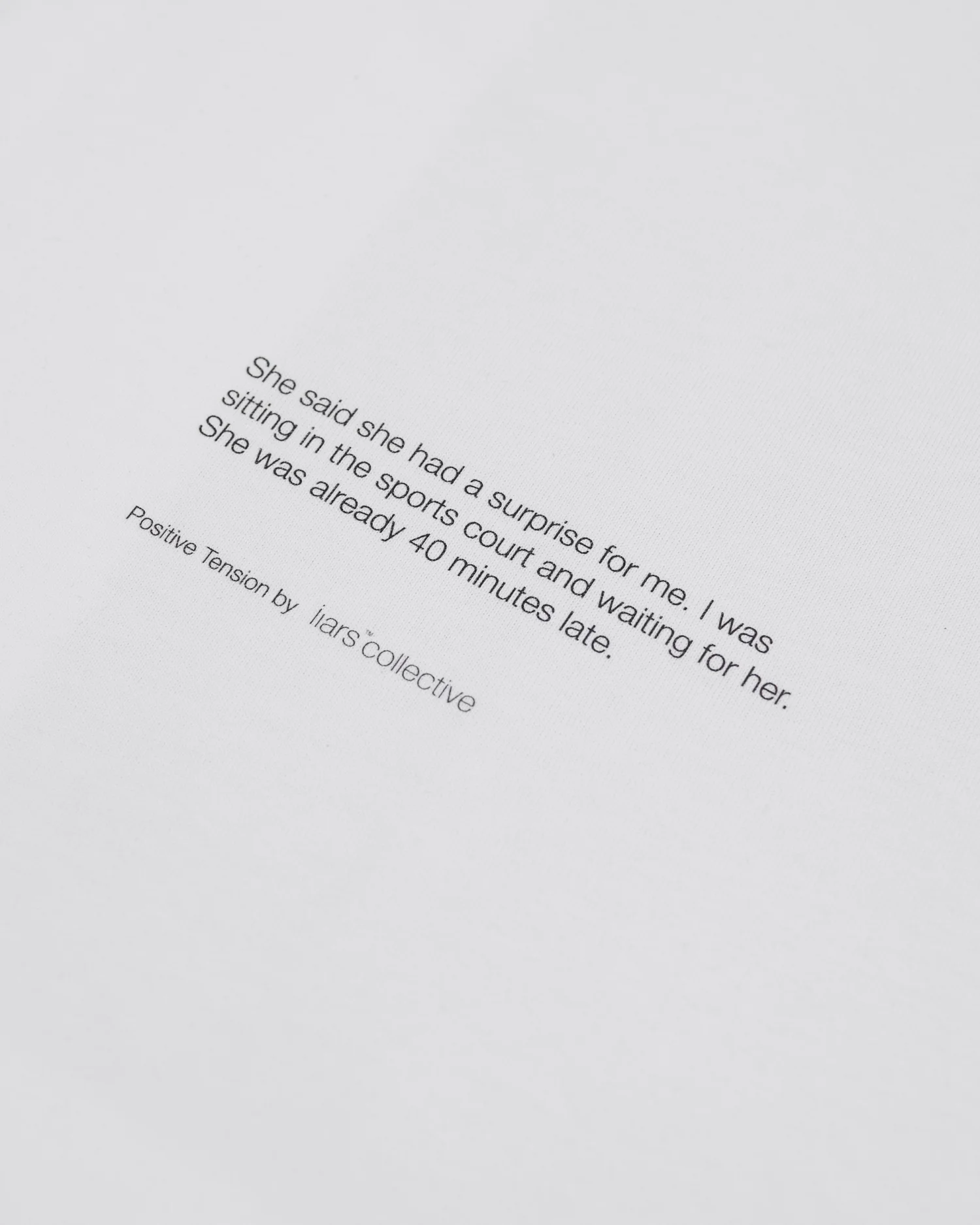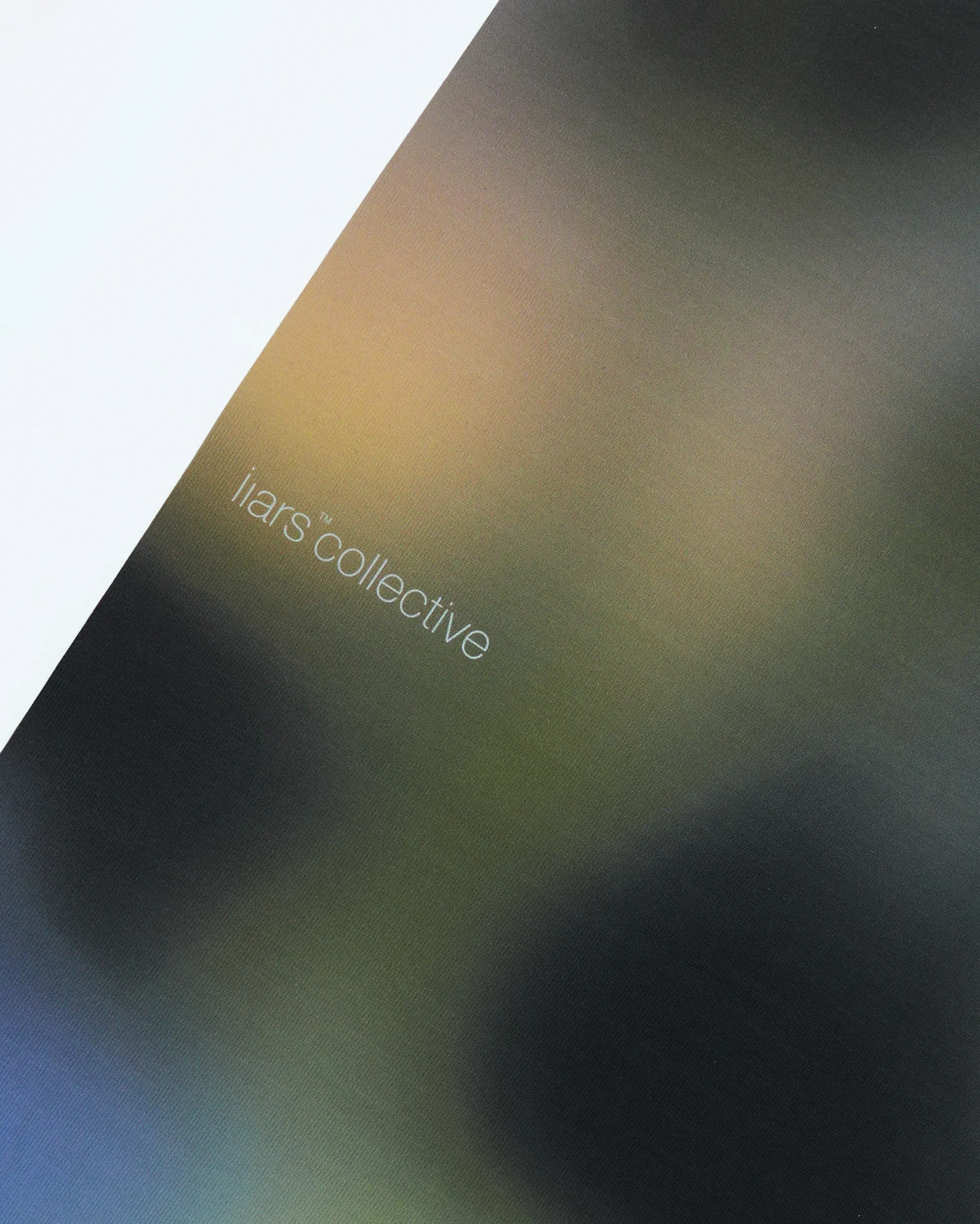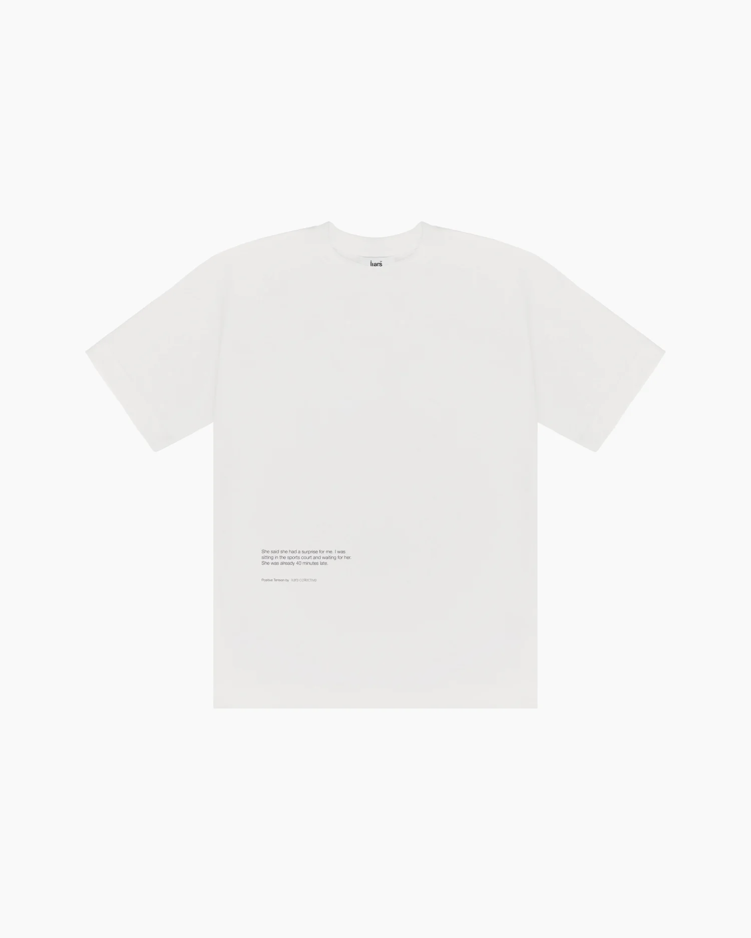 Белая хлопковая футболка свободного кроя с заниженной линией плеча. На спинке расположена крупная прямоугольная графика с мягким абстрактным градиентом в сине-зеленых и охристых тонах. Лаконичный логотип Liars Collective интегрирован в центральную часть принта. Передняя панель изделия дополнена минималистичным текстовым блоком в нижней части, содержащим короткое повествование, раскрывающее эмоциональный контекст коллекции. Плотный трикотаж премиального качества.
