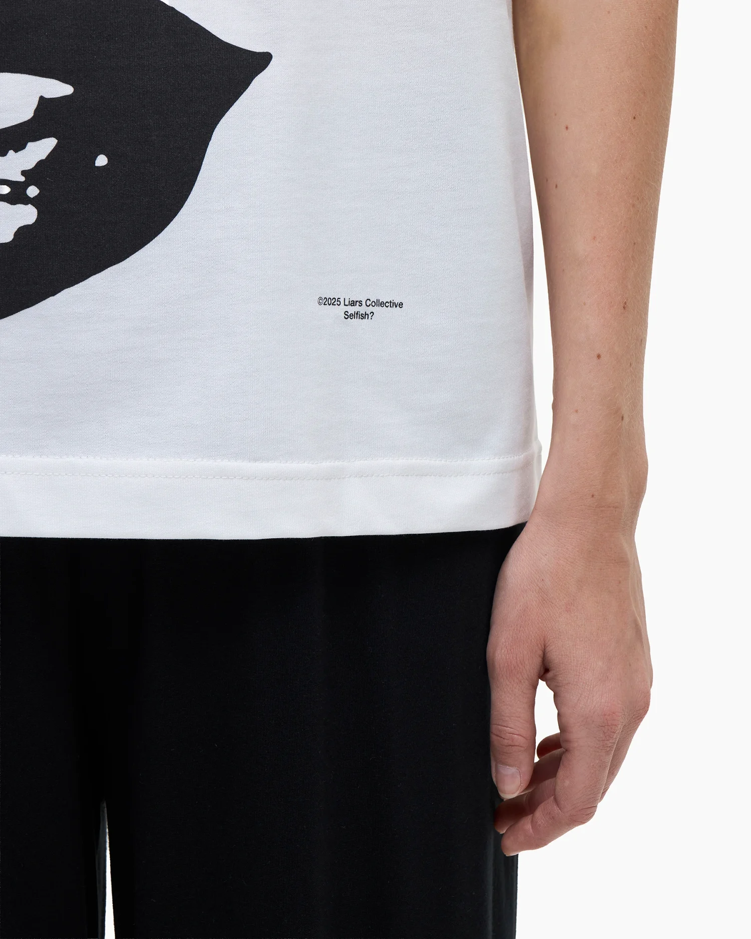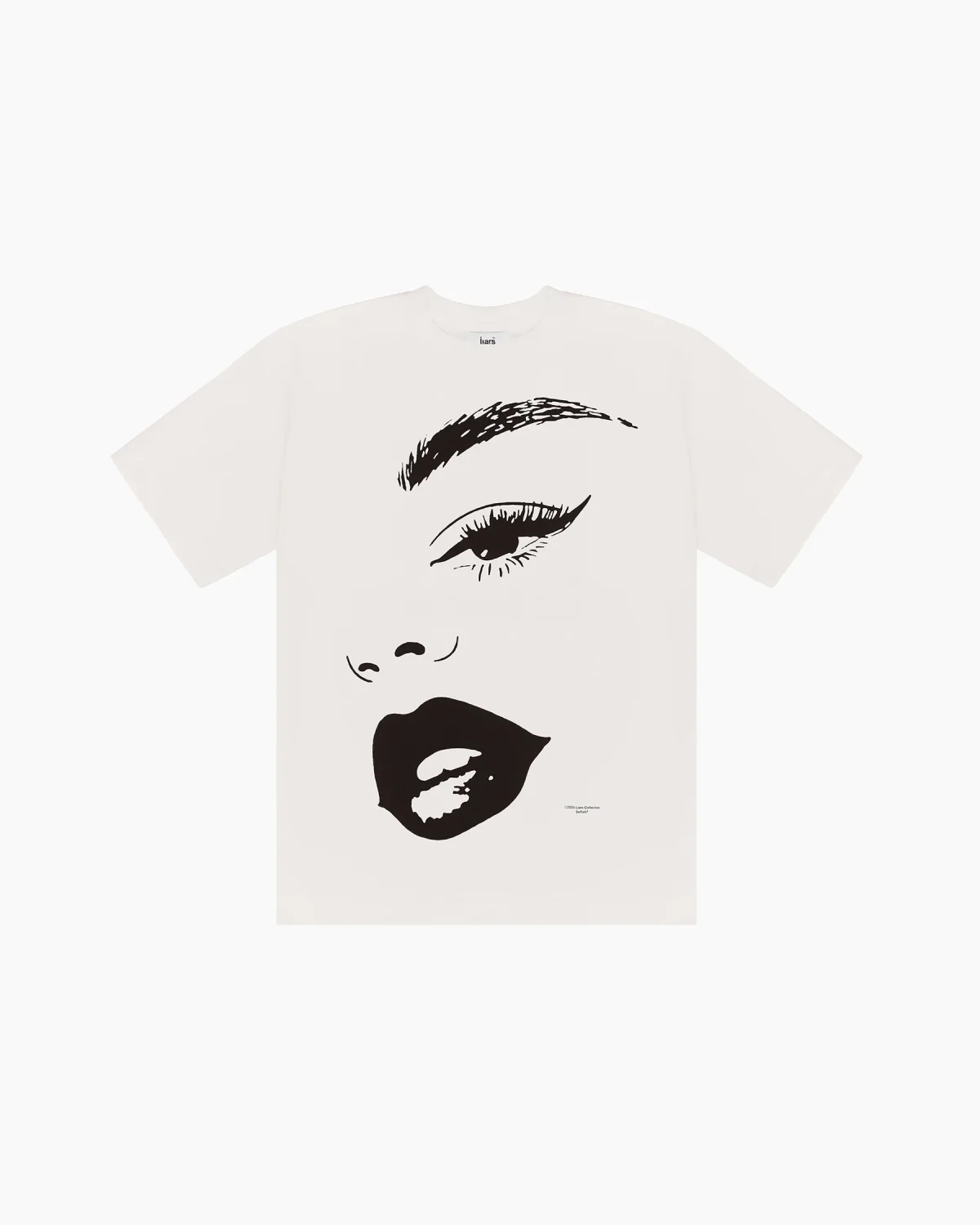 Белая хлопковая футболка свободного кроя с заниженной линией плеча. Лицевая сторона изделия декорирована масштабным графическим принтом, представляющим собой стилизованный фрагмент женского лица. Контрастная черная графика выполнена в технике трафаретной печати, что обеспечивает насыщенность цвета и долговечность изображения. Плотный трикотаж премиального качества позволяет футболке сохранять объемную форму.