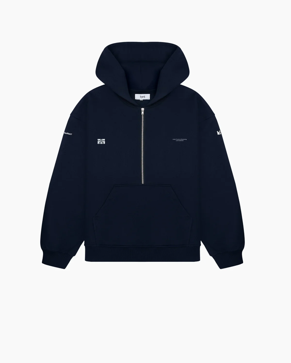 Темно-синие худи свободного кроя, выполненный из плотного хлопкового футера премиального качества. Модель оснащена глубоким капюшоном и металлической молнией до середины груди (half-zip), переходящей во вместительный карман-кенгуру. Изделие отличается сложной системой графического брендирования: на груди расположены технические принты и микро-логотипы, а рукава дополнены контрастными надписями «Selfish?» и «lc». Спинка декорирована минималистичным текстовым блоком «liars collective» и изящной абстрактной линией. Выверенный оверсайз-силуэт с заниженной линией плеча и широкими эластичными манжетами.
