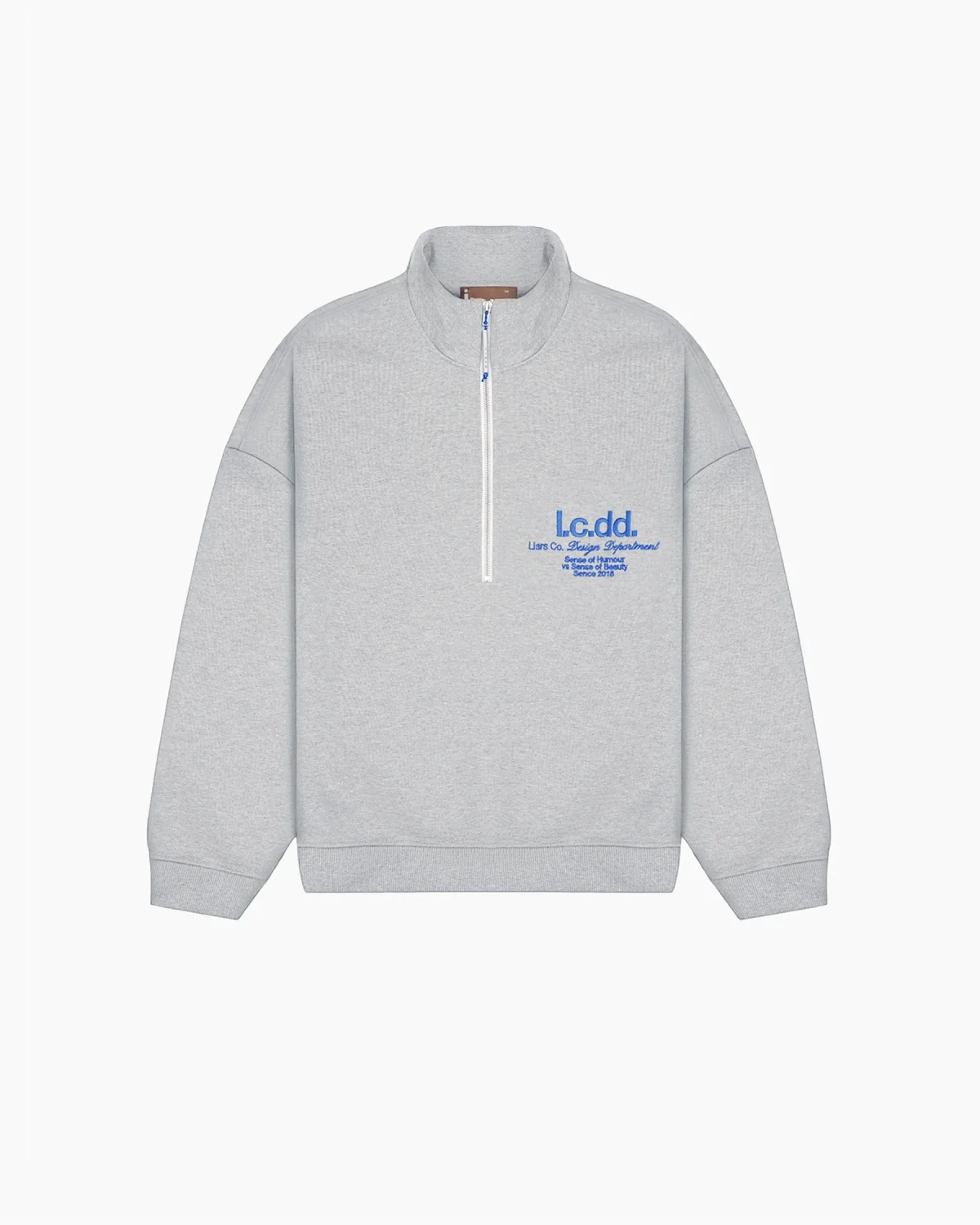 Свитшот свободного кроя в меланжевом сером оттенке, выполненный из плотного хлопкового трикотажа. Изделие оснащено высоким воротником-стойкой на молнии до середины груди (half-zip). На левой стороне груди расположен контрастный принт насыщенного синего цвета с аббревиатурой «Lc.dd.» и указанием подразделения «Design Department». Особое внимание уделено деталям фурнитуры: металлическая молния дополнена длинным брендированным пуллером с надписью «liars» и акцентным синим шнурком. Свободный силуэт с заниженной линией плеча и эластичные манжеты.